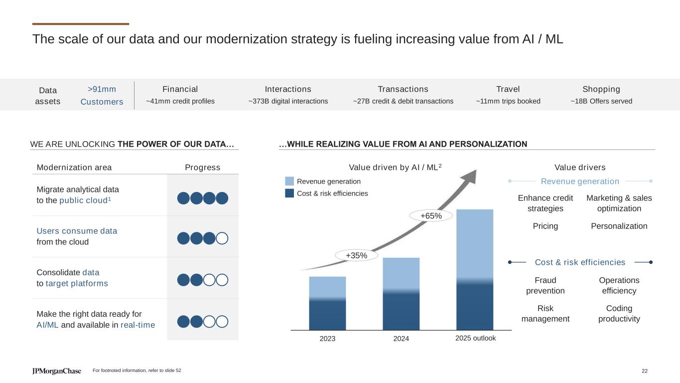 2019 2024 2025O Operations: Realizing productivity gains OPERATIONS EXPENSE ($B) KEY PERFORMANCE METRICS 5% Total Accounts 7% Transactions 12% Fraud attack rate ~Flat~Flat ~Flat 3% 7%11% >25% Accounts serviced per Operations headcount 2019 2024 +5 years ~15% productivity vs. 2019 >40% productivity vs. 2024 (10%) +28% OPERATIONS PRODUCTIVITY EX. HOME LENDING2 – ILLUSTRATIVE (29%) Servicing calls per account ~Flat Cost of fraud (bps) (15%) Processing cost per account1 ~Flat Operations headcount 2019 vs. 2024 2019-2024 CAGR Statement and payment processing Servicing / account support Fraud losses and operating expense 3% CAGR 4% YoY +13% >25% 5+ years 2025 outlook For footnoted information, refer to slide 52 20 4 21