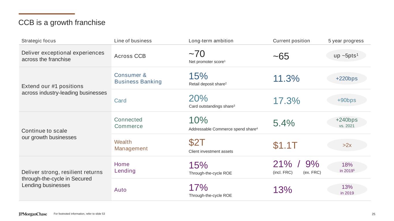 21% / 9% CCB is a growth franchise Strategic focus Line of business Long-term ambition Current position 5 year progress Deliver exceptional experiences across the franchise Across CCB ~70 Net promoter score1 ~65 Extend our #1 positions across industry-leading businesses Consumer & Business Banking 15% Retail deposit share2 11.3% Card 20% Card outstandings share3 17.3% Continue to scale our growth businesses Connected Commerce 10% Addressable Commerce spend share4 5.4% Wealth Management $2T Client investment assets $1.1T Deliver strong, resilient returns through-the-cycle in Secured Lending businesses Home Lending 15% Through-the-cycle ROE Auto 17% Through-the-cycle ROE +220bps +90bps +240bps vs. 2021 >2x up ~5pts1 13% in 201913% (incl. FRC) (ex. FRC) 18% in 20195 For footnoted information, refer to slide 53 25