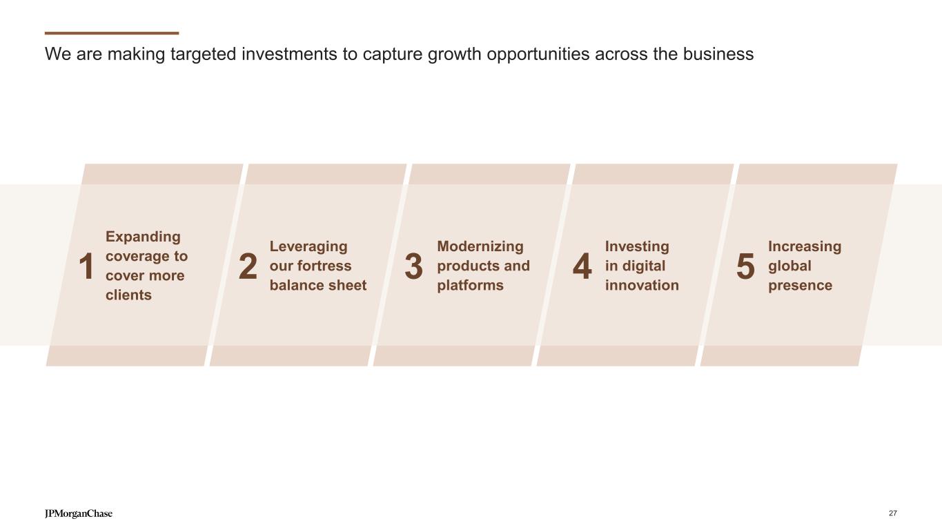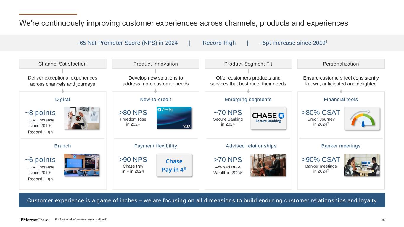 We’re continuously improving customer experiences across channels, products and experiences Record High Record High ~8 points CSAT increase since 20192 Digital Branch ~6 points CSAT increase since 20192 Product Innovation New-to-credit Payment flexibility >90 NPS Chase Pay in 4 in 2024 >80 NPS Freedom Rise in 2024 Personalization Financial tools Banker meetings >90% CSAT Banker meetings in 20242 >80% CSAT Credit Journey in 20242 Product-Segment Fit Emerging segments Advised relationships ~70 NPS Secure Banking in 2024 >70 NPS Advised BB & Wealth in 20243 Develop new solutions to address more customer needs Ensure customers feel consistently known, anticipated and delighted Offer customers products and services that best meet their needs Deliver exceptional experiences across channels and journeys ~65 Net Promoter Score (NPS) in 2024 | Record High | ~5pt increase since 20191 Channel Satisfaction Customer experience is a game of inches – we are focusing on all dimensions to build enduring customer relationships and loyalty For footnoted information, refer to slide 53 Chase Pay in 4® 26