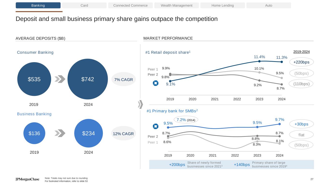 Deposit and small business primary share gains outpace the competition Banking Card Connected Commerce Wealth Management Peer 2 Peer 1 +220bps (50bps) (110bps) 2019 2024 2019 2024 7% CAGR 12% CAGR AVERAGE DEPOSITS ($B) Business Banking Consumer Banking MARKET PERFORMANCE Home Lending Auto $742$535 $234$136 9.9% 10.1% 9.5% 9.1% 11.4% 11.3% 9.8% 9.2% 8.7% 2019 2020 2021 2022 2023 2024 #1 Retail deposit share1 2019-2024 Note: Totals may not sum due to rounding For footnoted information, refer to slide 53 +30bps flat (50bps) Peer 1 Peer 2 +200bps Share of newly formed businesses since 20213 +140bps Primary share of large businesses since 20194 #1 Primary bank for SMBs2 8.6% 8.3% 8.1% 9.5% 9.5% 9.7% 8.7% 8.8% 8.7% 2019 2020 2021 2022 2023 2024 7.2% (2014) 27