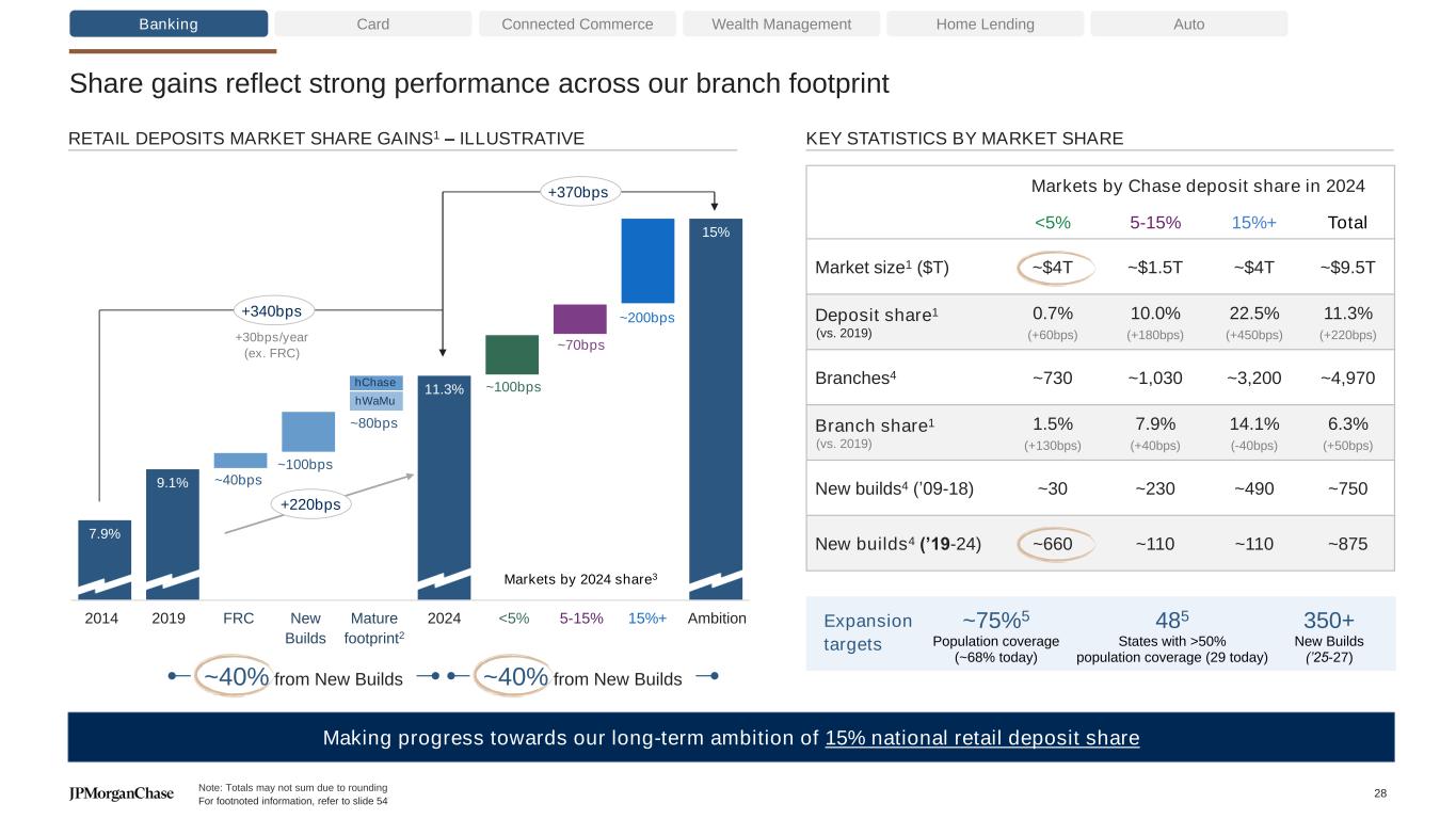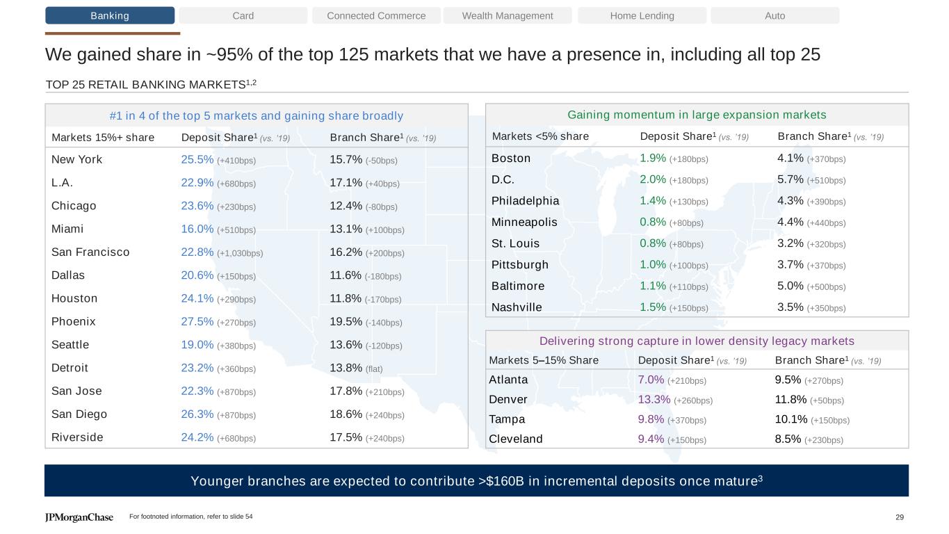 7.9% 9.1% 11.3% 15% 2014 2019 FRC New Builds Mature footprint 2024 <5% 5-15% 15%+ Target +220bps Share gains reflect strong performance across our branch footprint KEY STATISTICS BY MARKET SHARE 2014 2019 FRC 2024 Ambition Making progress towards our long-term ambition of 15% national retail deposit share Banking Card Connected Commerce Wealth Management Home Lending Auto New Builds Mature footprint2 ~40bps ~100bps ~80bps ~100bps ~70bps ~200bps 350+ New Builds (’25-27) Markets by Chase deposit share in 2024 <5% 5-15% 15%+ Total Market size1 ($T) ~$4T ~$1.5T ~$4T ~$9.5T Deposit share1 (vs. 2019) 0.7% (+60bps) 10.0% (+180bps) 22.5% (+450bps) 11.3% (+220bps) Branches4 ~730 ~1,030 ~3,200 ~4,970 Branch share1 (vs. 2019) 1.5% (+130bps) 7.9% (+40bps) 14.1% (-40bps) 6.3% (+50bps) New builds4 (’09-18) ~30 ~230 ~490 ~750 New builds4 (’19-24) ~660 ~110 ~110 ~875 <5% 5-15% 15%+ RETAIL DEPOSITS MARKET SHARE GAINS1 – ILLUSTRATIVE +370bps Markets by 2024 share3 ~75%5 Population coverage (~68% today) 485 States with >50% population coverage (29 today) Expansion targets +340bps +30bps/year (ex. FRC) Note: Totals may not sum due to rounding For footnoted information, refer to slide 54 28 ~40% from New Builds hChase hWaMu ~40% from New Builds
