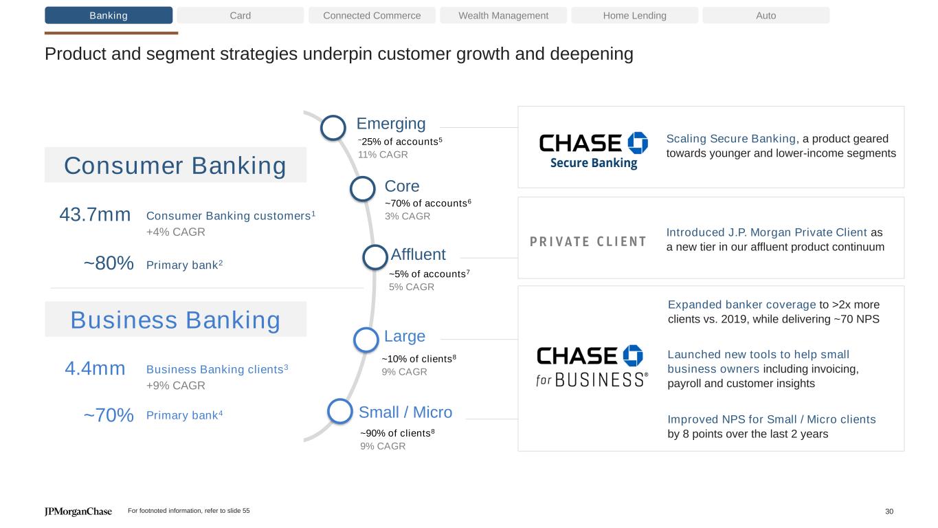 We gained share in ~95% of the top 125 markets that we have a presence in, including all top 25 Card Connected Commerce Wealth Management Home Lending AutoBanking Younger branches are expected to contribute >$160B in incremental deposits once mature3 Delivering strong capture in lower density legacy markets Markets 5–15% Share Deposit Share1 (vs. ’19) Branch Share1 (vs. ’19) Atlanta 7.0% (+210bps) 9.5% (+270bps) Denver 13.3% (+260bps) 11.8% (+50bps) Tampa 9.8% (+370bps) 10.1% (+150bps) Cleveland 9.4% (+150bps) 8.5% (+230bps) Gaining momentum in large expansion markets Markets <5% share Deposit Share1 (vs. ’19) Branch Share1 (vs. ’19) Boston 1.9% (+180bps) 4.1% (+370bps) D.C. 2.0% (+180bps) 5.7% (+510bps) Philadelphia 1.4% (+130bps) 4.3% (+390bps) Minneapolis 0.8% (+80bps) 4.4% (+440bps) St. Louis 0.8% (+80bps) 3.2% (+320bps) Pittsburgh 1.0% (+100bps) 3.7% (+370bps) Baltimore 1.1% (+110bps) 5.0% (+500bps) Nashville 1.5% (+150bps) 3.5% (+350bps) #1 in 4 of the top 5 markets and gaining share broadly Markets 15%+ share Deposit Share1 (vs. ’19) Branch Share1 (vs. ’19) New York 25.5% (+410bps) 15.7% (-50bps) L.A. 22.9% (+680bps) 17.1% (+40bps) Chicago 23.6% (+230bps) 12.4% (-80bps) Miami 16.0% (+510bps) 13.1% (+100bps) San Francisco 22.8% (+1,030bps) 16.2% (+200bps) Dallas 20.6% (+150bps) 11.6% (-180bps) Houston 24.1% (+290bps) 11.8% (-170bps) Phoenix 27.5% (+270bps) 19.5% (-140bps) Seattle 19.0% (+380bps) 13.6% (-120bps) Detroit 23.2% (+360bps) 13.8% (flat) San Jose 22.3% (+870bps) 17.8% (+210bps) San Diego 26.3% (+870bps) 18.6% (+240bps) Riverside 24.2% (+680bps) 17.5% (+240bps) TOP 25 RETAIL BANKING MARKETS1,2 For footnoted information, refer to slide 54 29