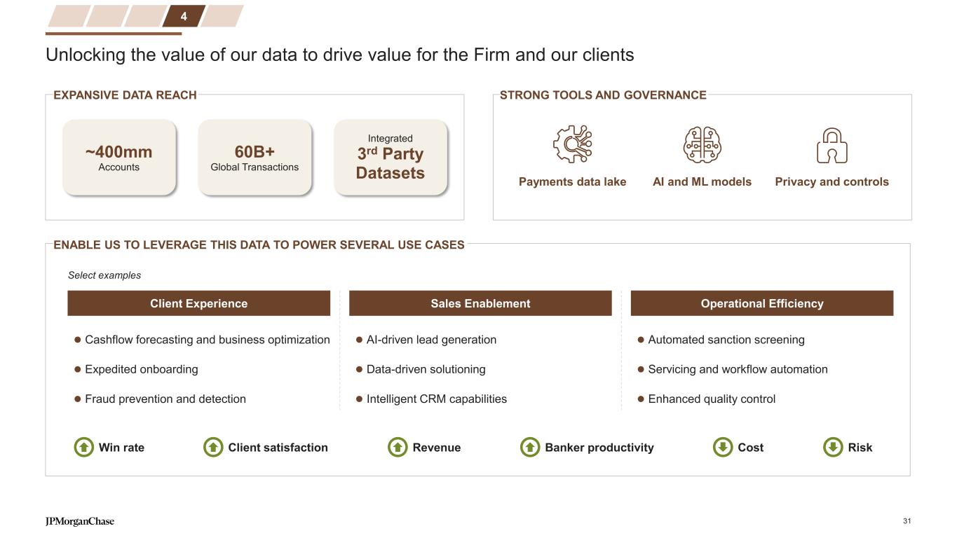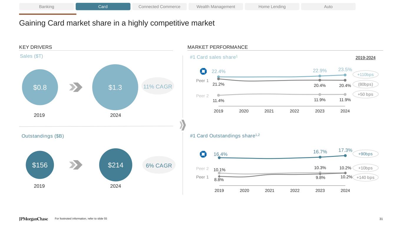 Product and segment strategies underpin customer growth and deepening Card Wealth Management Home Lending AutoBanking Connected Commerce % Emerging Core Affluent Introduced J.P. Morgan Private Client as a new tier in our affluent product continuum Scaling Secure Banking, a product geared towards younger and lower-income segments ~80% Primary bank2 ~25% of accounts5 11% CAGR ~70% of accounts6 3% CAGR ~5% of accounts7 5% CAGR ~90% of clients8 9% CAGR Small / Micro ~10% of clients8 9% CAGR Large Launched new tools to help small business owners including invoicing, payroll and customer insights Expanded banker coverage to >2x more clients vs. 2019, while delivering ~70 NPS Consumer Banking 43.7mm Consumer Banking customers1 +4% CAGR ~70% Primary bank4 4.4mm Business Banking clients3 +9% CAGR Business Banking Improved NPS for Small / Micro clients by 8 points over the last 2 years For footnoted information, refer to slide 55 30