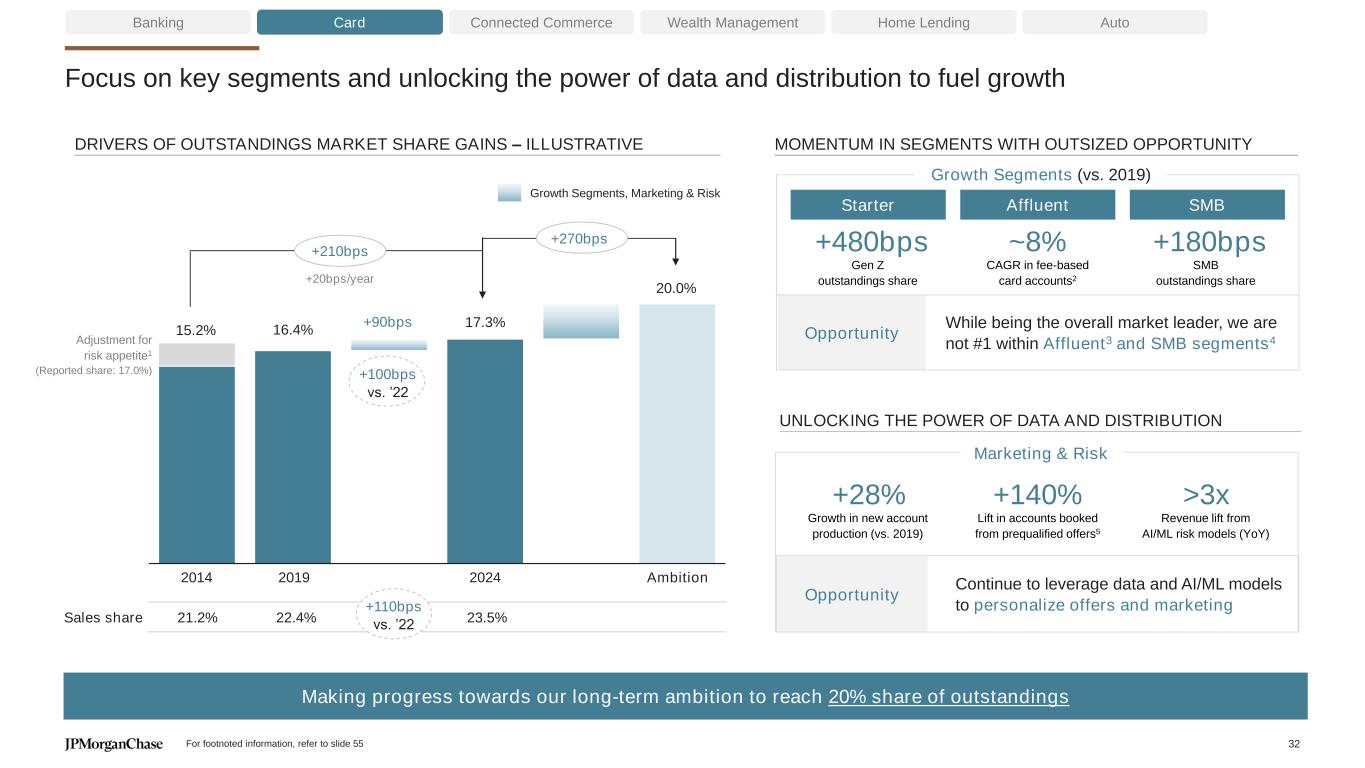 Gaining Card market share in a highly competitive market KEY DRIVERS MARKET PERFORMANCE 11.4% 11.9% 11.9% 22.4% 22.9% 23.5% 21.2% 20.4% 20.4% 2019 2020 2021 2022 2023 2024 Peer 1 Peer 2 10.1% 10.3% 10.2% 16.4% 16.7% 17.3% 8.8% 9.8% 10.2% 2019 2020 2021 2022 2023 2024 Peer 2 Peer 1 Banking Card Connected Commerce Wealth Management Home Lending Auto +110bps (80bps) +50 bps +90bps +10bps +140 bps Outstandings ($B) 2019 2024 11% CAGR 6% CAGR Sales ($T) $1.3$0.8 $214$156 20242019 #1 Card sales share1 #1 Card Outstandings share1,2 2019-2024 For footnoted information, refer to slide 55 31