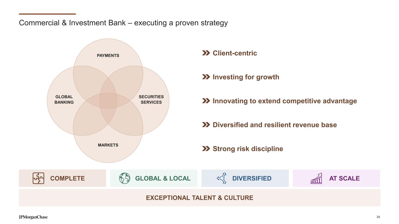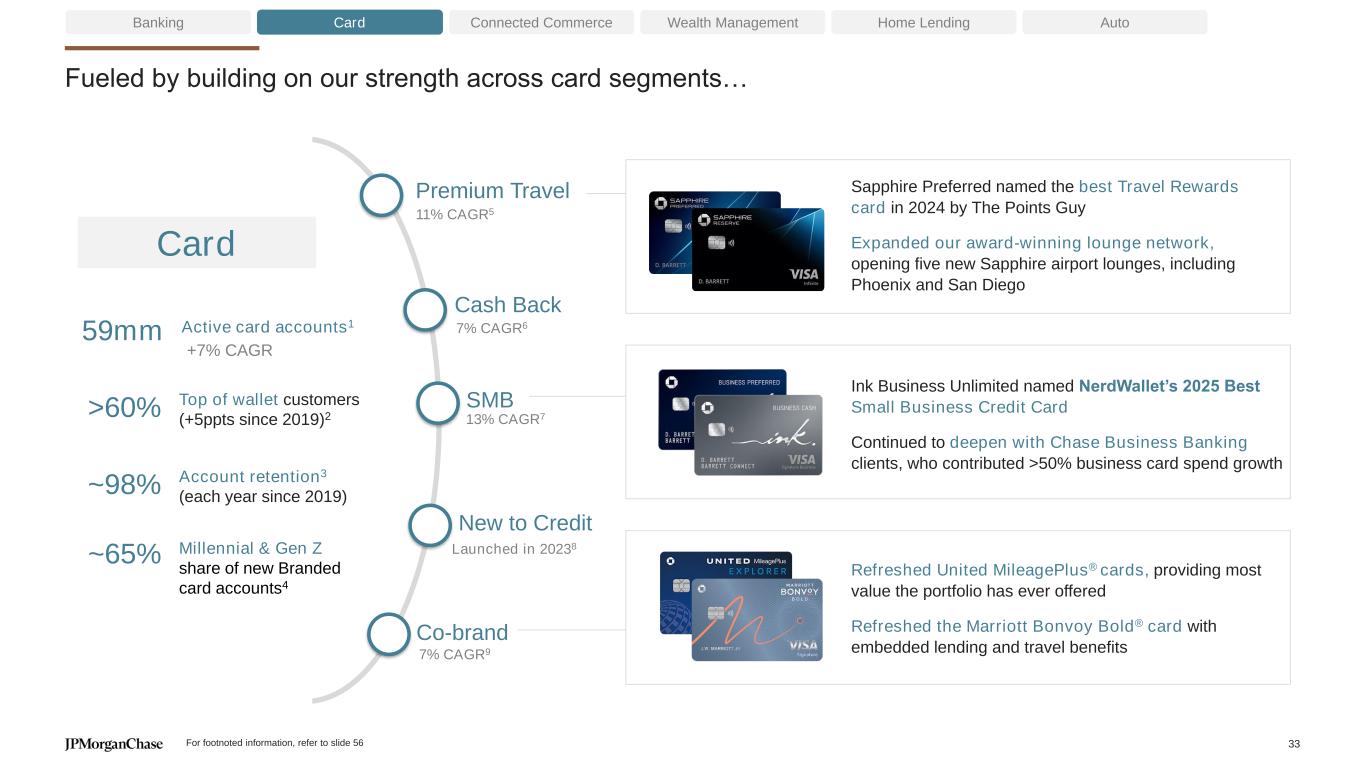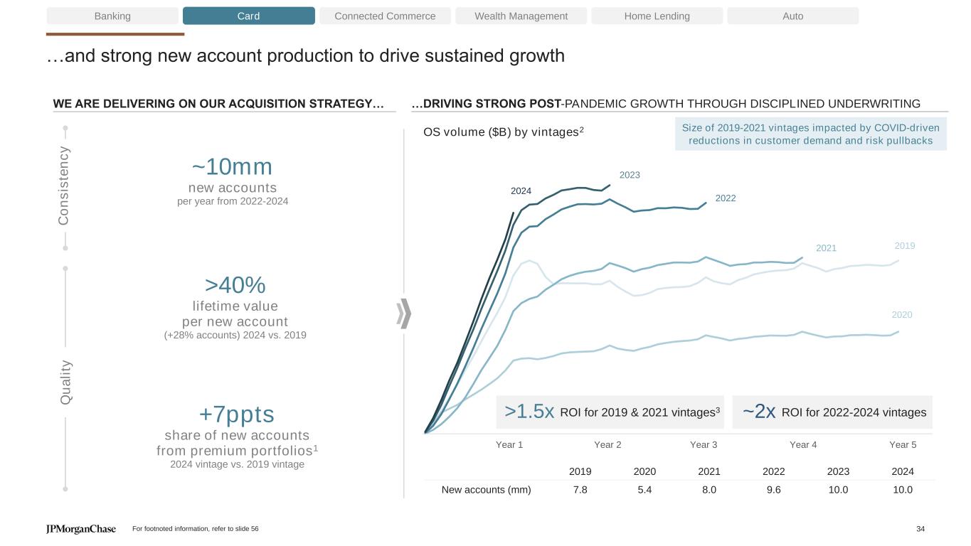 Fueled by building on our strength across card segments… Banking Card Connected Commerce Wealth Management Home Lending Auto Sapphire Preferred named the best Travel Rewards card in 2024 by The Points Guy Expanded our award-winning lounge network, opening five new Sapphire airport lounges, including Phoenix and San Diego Ink Business Unlimited named NerdWallet’s 2025 Best Small Business Credit Card Continued to deepen with Chase Business Banking clients, who contributed >50% business card spend growth Refreshed United MileagePlus® cards, providing most value the portfolio has ever offered Refreshed the Marriott Bonvoy Bold® card with embedded lending and travel benefits >60% 59mm Top of wallet customers (+5ppts since 2019)2 ~98% Account retention3 (each year since 2019) Premium Travel Cash Back New to Credit SMB Co-brand Active card accounts1 +7% CAGR 11% CAGR5 7% CAGR6 13% CAGR7 Launched in 20238 7% CAGR9 ~65% Millennial & Gen Z share of new Branded card accounts4 Card For footnoted information, refer to slide 56 33