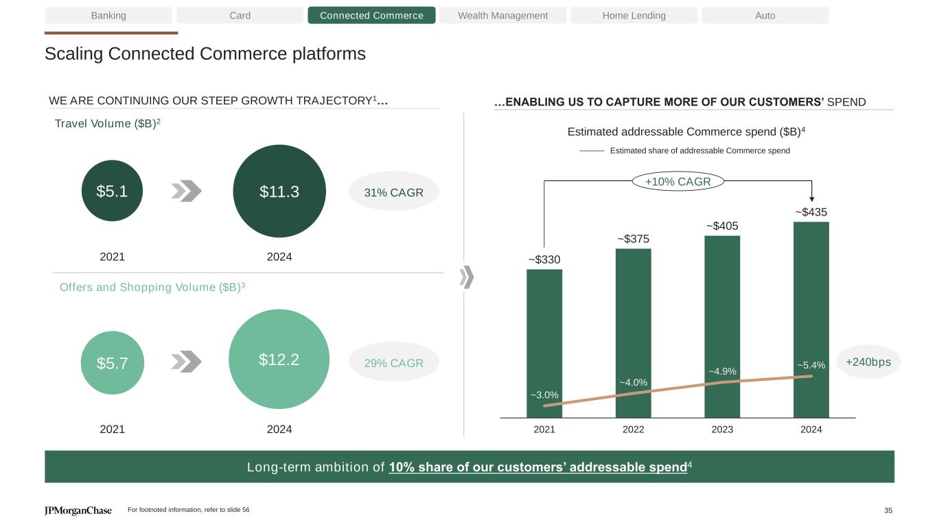 …and strong new account production to drive sustained growth OS volume ($B) by vintages2 Banking Card Connected Commerce Wealth Management 2024 Home Lending Auto Size of 2019-2021 vintages impacted by COVID-driven reductions in customer demand and risk pullbacks 2023 2022 2021 2019 2020 …DRIVING STRONG POST-PANDEMIC GROWTH THROUGH DISCIPLINED UNDERWRITING Year 5 ~10mm new accounts per year from 2022-2024 C o n s is te n c y 2019 2020 2021 2022 2023 2024 New accounts (mm) 7.8 5.4 8.0 9.6 10.0 10.0 WE ARE DELIVERING ON OUR ACQUISITION STRATEGY… >40% lifetime value per new account (+28% accounts) 2024 vs. 2019 +7ppts share of new accounts from premium portfolios1 2024 vintage vs. 2019 vintage Q u a li ty ~2x ROI for 2022-2024 vintages>1.5x ROI for 2019 & 2021 vintages3 Year 1 Year 3 Year 2 Year 4 For footnoted information, refer to slide 56 34
