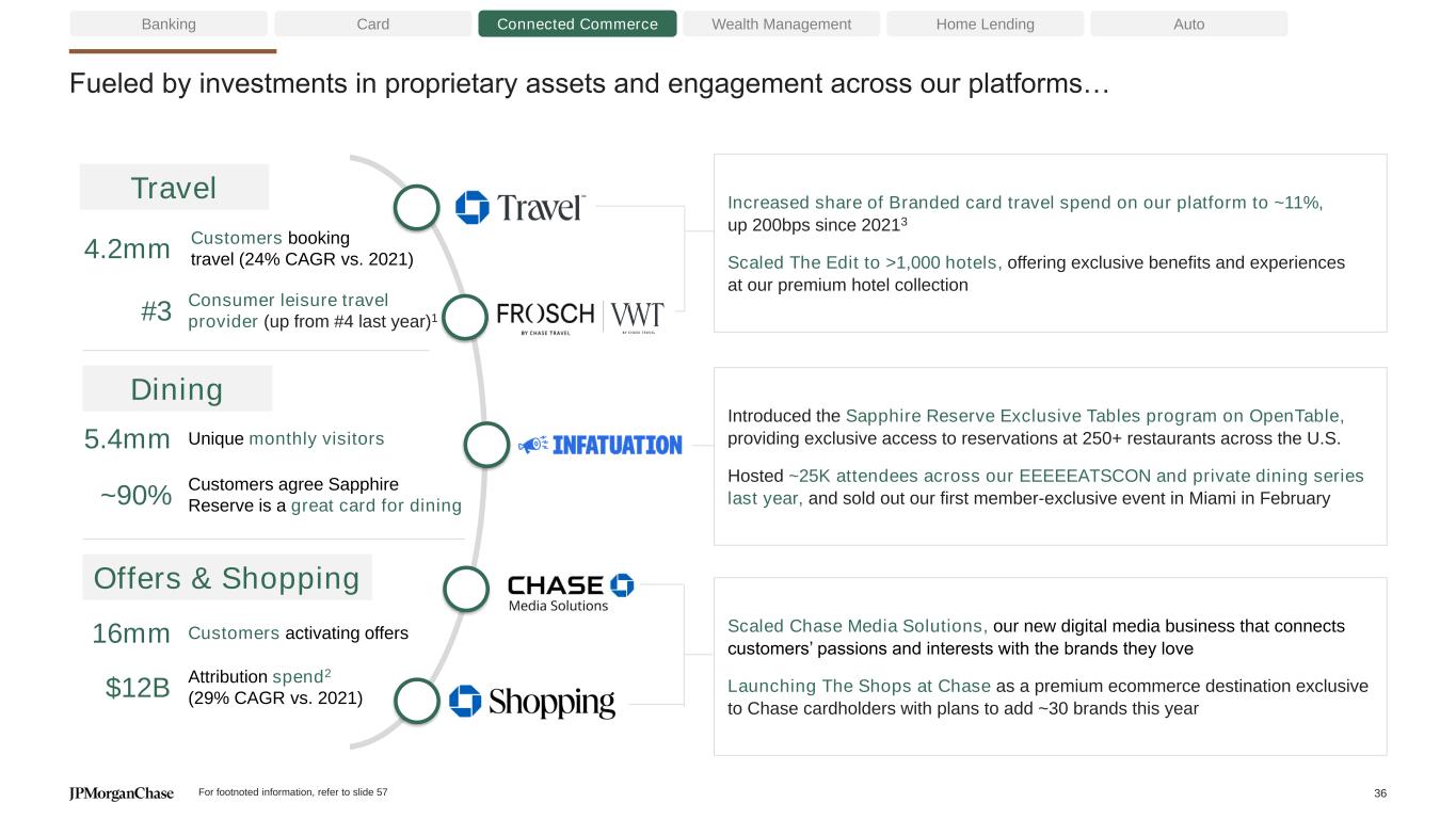 Scaling Connected Commerce platforms Long-term ambition of 10% share of our customers’ addressable spend4 Banking Card Connected Commerce Wealth Management Home Lending Auto WE ARE CONTINUING OUR STEEP GROWTH TRAJECTORY1… …ENABLING US TO CAPTURE MORE OF OUR CUSTOMERS’ SPEND $12.2 2021 2024 29% CAGR Offers and Shopping Volume ($B)3 2021 2024 31% CAGR Travel Volume ($B)2 $5.7 $11.3$5.1 ~$330 ~$375 ~$405 ~$435 ~3.0% ~4.0% ~4.9% ~5.4% ~2.0% ~4.0% ~6.0% ~8.0% ~10.0% ~12.0% ~14.0% ~16.0% ~18.0% ~20.0% 0 5E+10 1E+11 1.5E+11 2E+11 2.5E+11 3E+11 3.5E+11 4E+11 4.5E+11 5E+11 2021 2022 2023 2024 Estimated share of addressable Commerce spend +240bps Estimated addressable Commerce spend ($B)4 +10% CAGR For footnoted information, refer to slide 56 35