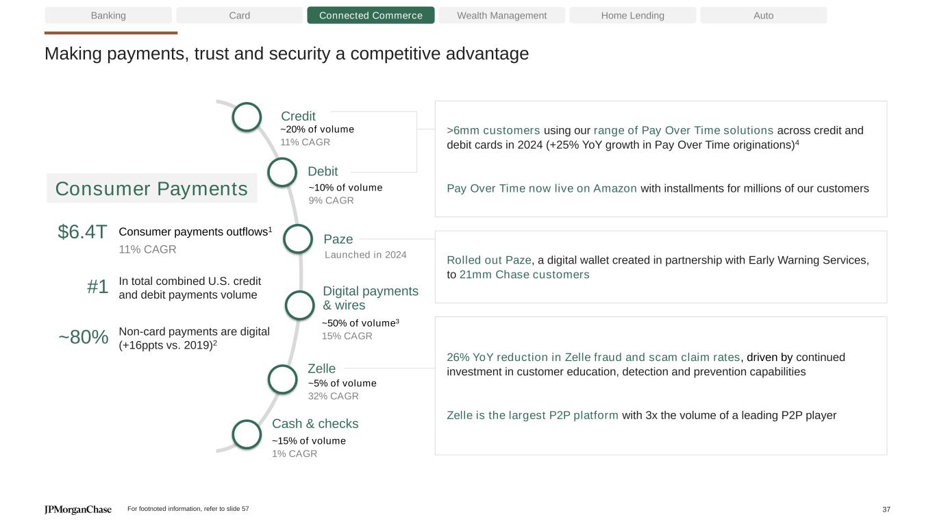 Fueled by investments in proprietary assets and engagement across our platforms… Banking Card Connected Commerce Wealth Management Home Lending Auto Customers booking travel (24% CAGR vs. 2021)4.2mm Increased share of Branded card travel spend on our platform to ~11%, up 200bps since 20213 Scaled The Edit to >1,000 hotels, offering exclusive benefits and experiences at our premium hotel collection Introduced the Sapphire Reserve Exclusive Tables program on OpenTable, providing exclusive access to reservations at 250+ restaurants across the U.S. Hosted ~25K attendees across our EEEEEATSCON and private dining series last year, and sold out our first member-exclusive event in Miami in February Scaled Chase Media Solutions, our new digital media business that connects customers’ passions and interests with the brands they love Launching The Shops at Chase as a premium ecommerce destination exclusive to Chase cardholders with plans to add ~30 brands this year #3 Consumer leisure travel provider (up from #4 last year)1 Travel Dining Unique monthly visitors5.4mm Customers agree Sapphire Reserve is a great card for dining~90% Offers & Shopping Customers activating offers16mm $12B Attribution spend2 (29% CAGR vs. 2021) For footnoted information, refer to slide 57 36