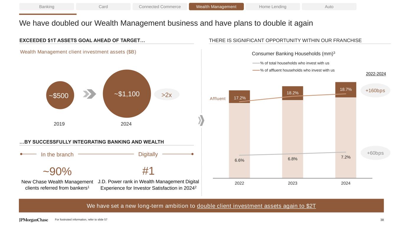 Making payments, trust and security a competitive advantage Banking Card Connected Commerce Wealth Management Home Lending Auto Credit Debit Zelle Digital payments & wires Cash & checks Paze 26% YoY reduction in Zelle fraud and scam claim rates, driven by continued investment in customer education, detection and prevention capabilities Zelle is the largest P2P platform with 3x the volume of a leading P2P player >6mm customers using our range of Pay Over Time solutions across credit and debit cards in 2024 (+25% YoY growth in Pay Over Time originations)4 Pay Over Time now live on Amazon with installments for millions of our customers Rolled out Paze, a digital wallet created in partnership with Early Warning Services, to 21mm Chase customers ~20% of volume 11% CAGR ~10% of volume 9% CAGR ~5% of volume 32% CAGR ~50% of volume3 15% CAGR ~15% of volume 1% CAGR Launched in 2024 #1 In total combined U.S. credit and debit payments volume Consumer payments outflows1$6.4T 11% CAGR ~80% Non-card payments are digital (+16ppts vs. 2019)2 Consumer Payments For footnoted information, refer to slide 57 37