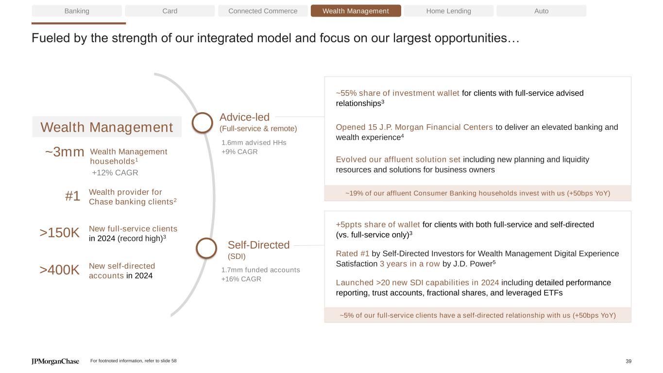 We have doubled our Wealth Management business and have plans to double it again Banking Card Connected Commerce Wealth Management Home Lending Auto We have set a new long-term ambition to double client investment assets again to $2T ~$1,100 2019 2024 >2x Wealth Management client investment assets ($B) ~$500 #1 J.D. Power rank in Wealth Management Digital Experience for Investor Satisfaction in 20242 ~90% New Chase Wealth Management clients referred from bankers1 6.6% 6.8% 7.2% 17.2% 18.2% 18.7% 2.0% 7.0% 12.0% 17.0% 22.0% 0 5000000 10000000 15000000 20000000 25000000 30000000 35000000 40000000 2022 2023 2024 % of total households who invest with us % of affluent households who invest with us Consumer Banking Households (mm)3 EXCEEDED $1T ASSETS GOAL AHEAD OF TARGET… THERE IS SIGNIFICANT OPPORTUNITY WITHIN OUR FRANCHISE +60bps +160bps In the branch Digitally …BY SUCCESSFULLY INTEGRATING BANKING AND WEALTH Affluent 2022-2024 For footnoted information, refer to slide 57 38