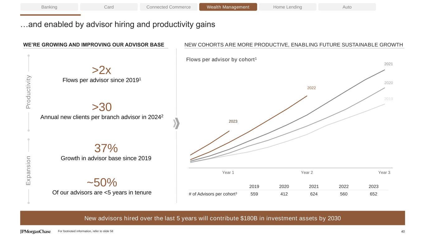 Slide 39 – Fueled by the strength of our integrated model and focus on our largest opportunities… 1. A household is a collection of individuals or entities aggregated together by name, address, tax identifier, and phone number 2. #1 outflow destination for Chase Consumer and Business deposit clients 3. Chase Wealth Management clients 4. As of April 24, 2025 5. J.P. Morgan Wealth Management received the highest score in the 2022 U.S. Wealth Management Digital Experience Study and the Self-Directed Investors segment of the J.D. Power 2023 & 2024 studies of customers’ overall satisfaction with wealth management websites and mobile apps. Visit jdpower.com/awards for more details. Note: All CAGRs from 2019 to 2024 Slide 40 – …and enabled by advisor hiring and productivity gains 1. Chase Wealth Management advisors only 2. Refers to full-service clients only 3. Represents number of advisors originally hired into each cohort Notes on slides 39-40 58