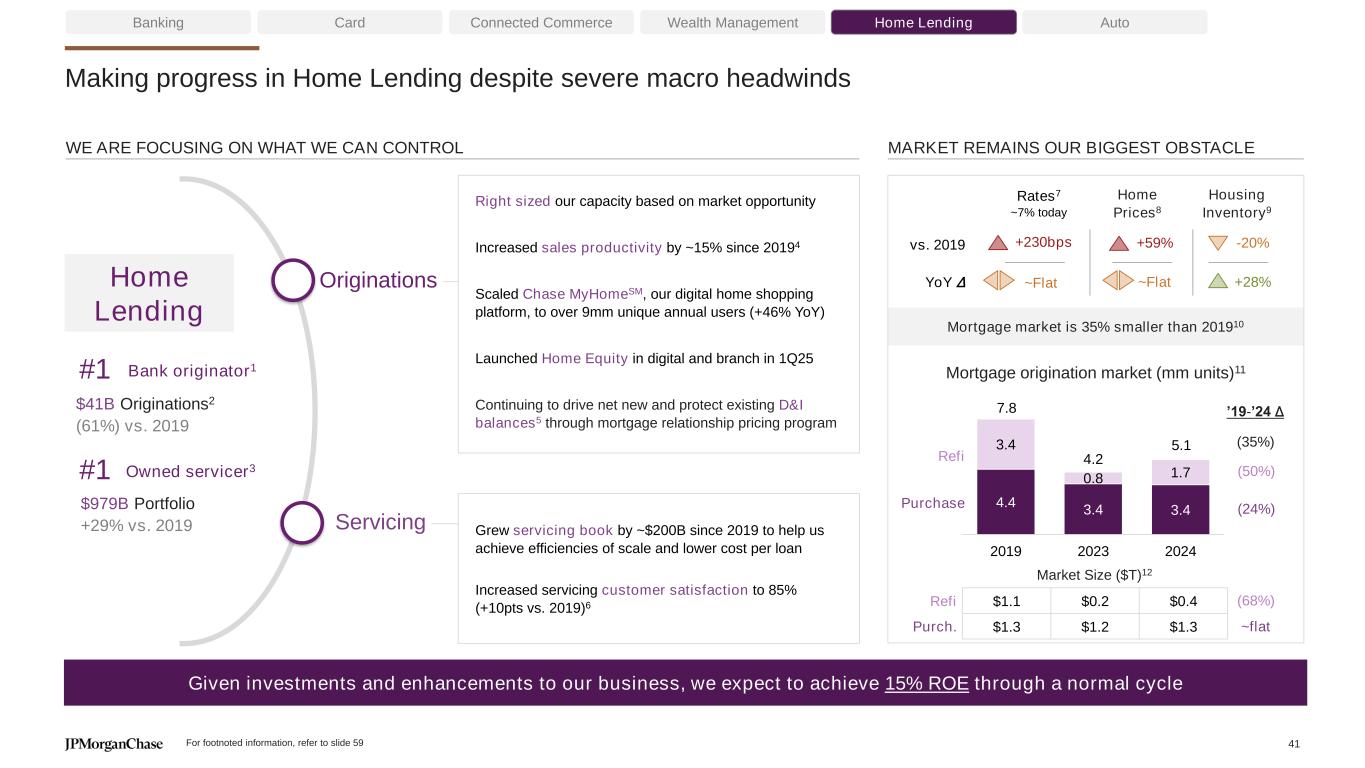 Mortgage market is 35% smaller than 201910 Making progress in Home Lending despite severe macro headwinds Banking Card Connected Commerce Wealth Management Home Lending Auto Given investments and enhancements to our business, we expect to achieve 15% ROE through a normal cycle WE ARE FOCUSING ON WHAT WE CAN CONTROL Mortgage origination market (mm units)11 MARKET REMAINS OUR BIGGEST OBSTACLE Originations $41B Originations2 (61%) vs. 2019 Servicing $979B Portfolio +29% vs. 2019 Rates7 ~7% today Home Prices8 Housing Inventory9 vs. 2019 YoY Δ ~Flat +230bps +28% -20% ~Flat +59% Home Lending #1 Bank originator1 #1 Owned servicer3 For footnoted information, refer to slide 59 4.4 3.4 3.4 3.4 0.8 1.7 2019 2023 2024 Refi Purch. Market Size ($T)12 Refi Purchase $1.1 $0.2 $0.4 $1.3 $1.2 $1.3 ’19-’24 Δ (50%) (24%) 7.8 4.2 5.1 (68%) ~flat (35%) Right sized our capacity based on market opportunity Increased sales productivity by ~15% since 20194 Scaled Chase MyHomeSM, our digital home shopping platform, to over 9mm unique annual users (+46% YoY) Launched Home Equity in digital and branch in 1Q25 Continuing to drive net new and protect existing D&I balances5 through mortgage relationship pricing program Grew servicing book by ~$200B since 2019 to help us achieve efficiencies of scale and lower cost per loan Increased servicing customer satisfaction to 85% (+10pts vs. 2019)6 41