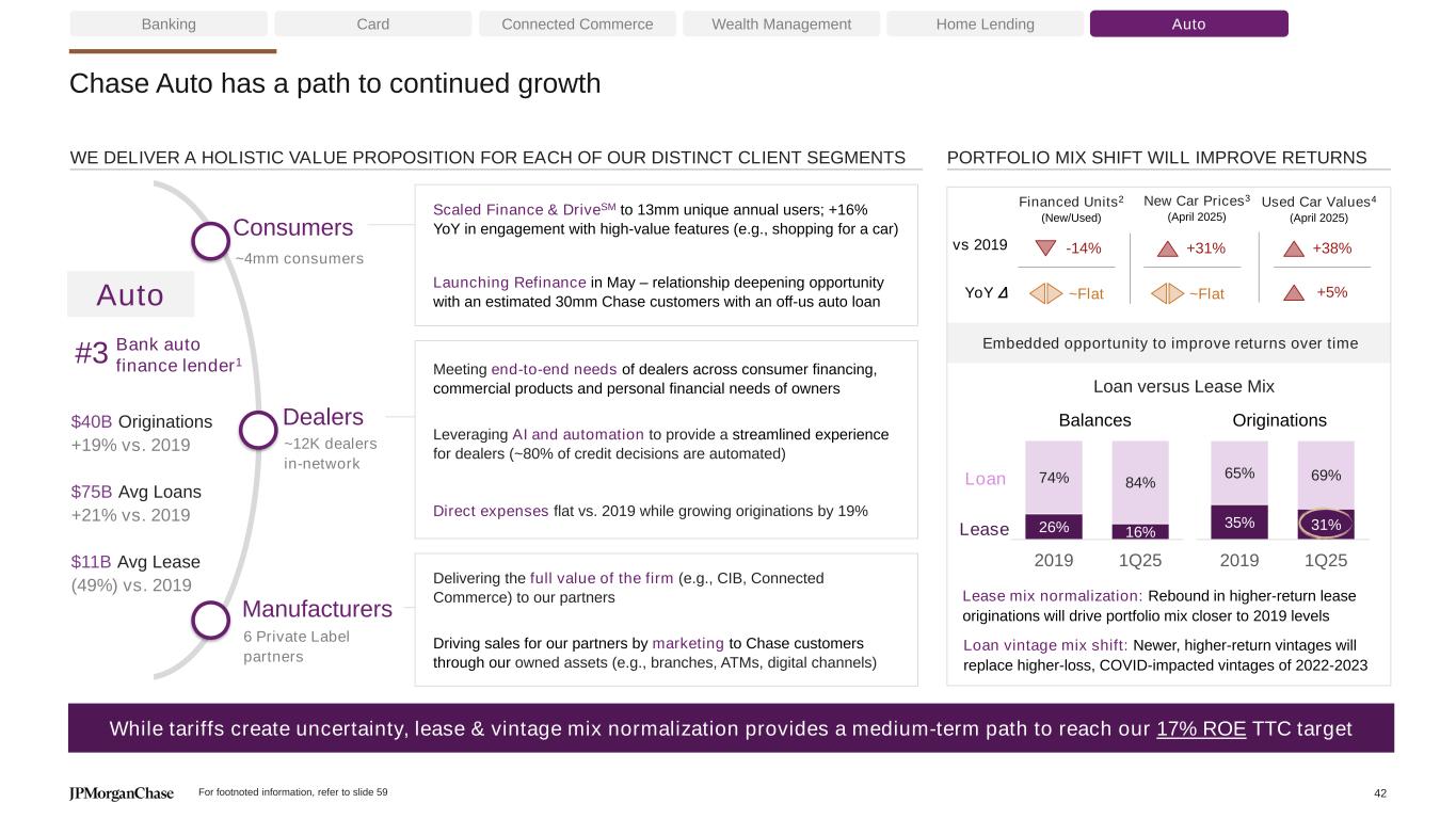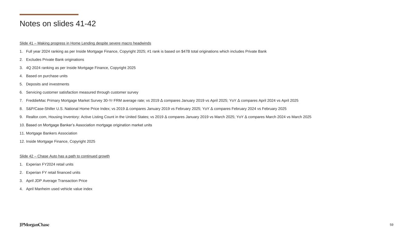 Slide 41 – Making progress in Home Lending despite severe macro headwinds 1. Full year 2024 ranking as per Inside Mortgage Finance, Copyright 2025; #1 rank is based on $47B total originations which includes Private Bank 2. Excludes Private Bank originations 3. 4Q 2024 ranking as per Inside Mortgage Finance, Copyright 2025 4. Based on purchase units 5. Deposits and investments 6. Servicing customer satisfaction measured through customer survey 7. FreddieMac Primary Mortgage Market Survey 30-Yr FRM average rate; vs 2019 Δ compares January 2019 vs April 2025; YoY Δ compares April 2024 vs April 2025 8. S&P/Case-Shiller U.S. National Home Price Index; vs 2019 Δ compares January 2019 vs February 2025; YoY Δ compares February 2024 vs February 2025 9. Realtor.com, Housing Inventory: Active Listing Count in the United States; vs 2019 Δ compares January 2019 vs March 2025; YoY Δ compares March 2024 vs March 2025 10. Based on Mortgage Banker’s Association mortgage origination market units 11. Mortgage Bankers Association 12. Inside Mortgage Finance, Copyright 2025 Slide 42 – Chase Auto has a path to continued growth 1. Experian FY2024 retail units 2. Experian FY retail financed units 3. April JDP Average Transaction Price 4. April Manheim used vehicle value index Notes on slides 41-42 59