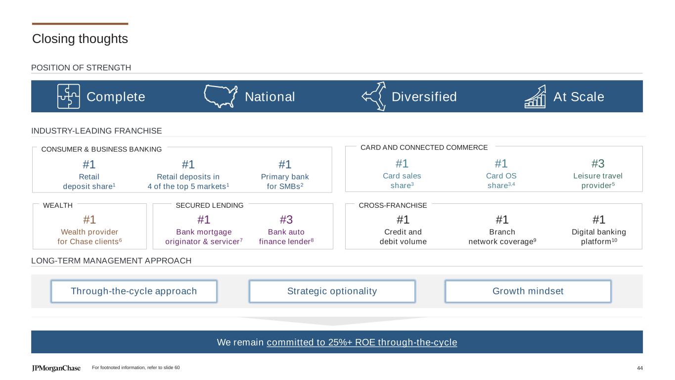 We remain committed to 25%+ ROE through-the-cycle #1 Retail deposit share1 #1 Primary bank for SMBs2 #1 Retail deposits in 4 of the top 5 markets1 CONSUMER & BUSINESS BANKING #1 Card sales share3 #1 Card OS share3,4 #3 Leisure travel provider5 CARD AND CONNECTED COMMERCE #1 Wealth provider for Chase clients6 #1 Bank mortgage originator & servicer7 #3 Bank auto finance lender8 WEALTH SECURED LENDING #1 Branch network coverage9 #1 Credit and debit volume #1 Digital banking platform10 CROSS-FRANCHISE Through-the-cycle approach Strategic optionality Growth mindset INDUSTRY-LEADING FRANCHISE LONG-TERM MANAGEMENT APPROACH POSITION OF STRENGTH Closing thoughts Complete National Diversified At Scale For footnoted information, refer to slide 60 44