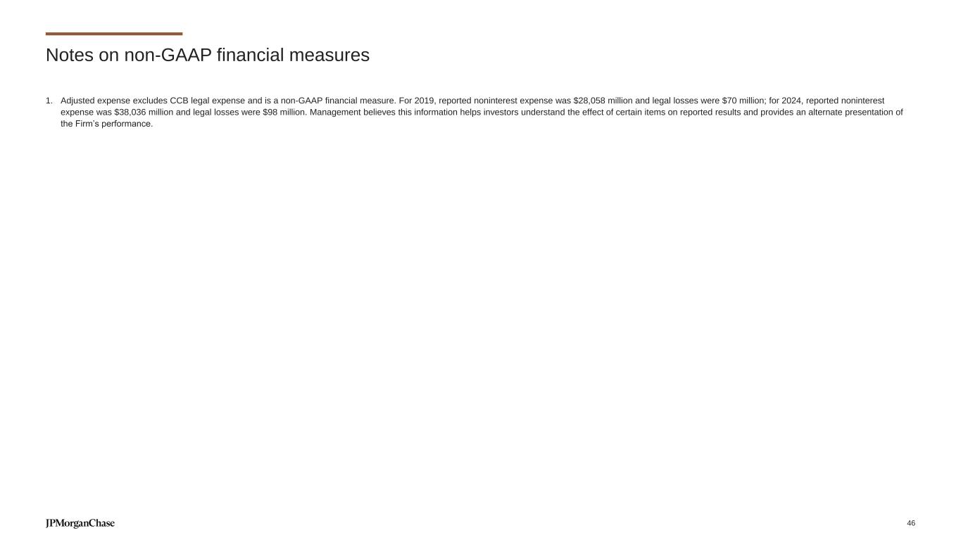 1. Adjusted expense excludes CCB legal expense and is a non-GAAP financial measure. For 2019, reported noninterest expense was $28,058 million and legal losses were $70 million; for 2024, reported noninterest expense was $38,036 million and legal losses were $98 million. Management believes this information helps investors understand the effect of certain items on reported results and provides an alternate presentation of the Firm’s performance. Notes on non-GAAP financial measures 46