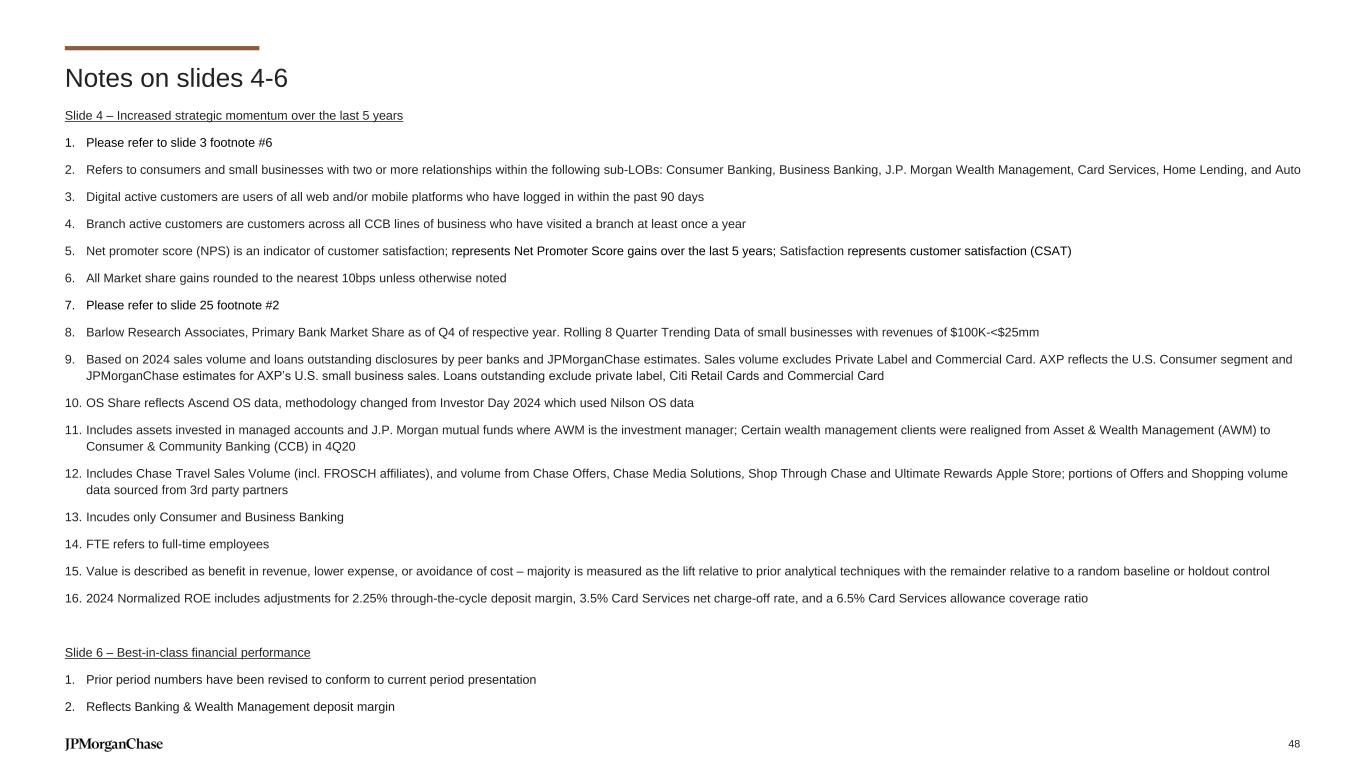 Slide 4 – Increased strategic momentum over the last 5 years 1. Please refer to slide 3 footnote #6 2. Refers to consumers and small businesses with two or more relationships within the following sub-LOBs: Consumer Banking, Business Banking, J.P. Morgan Wealth Management, Card Services, Home Lending, and Auto 3. Digital active customers are users of all web and/or mobile platforms who have logged in within the past 90 days 4. Branch active customers are customers across all CCB lines of business who have visited a branch at least once a year 5. Net promoter score (NPS) is an indicator of customer satisfaction; represents Net Promoter Score gains over the last 5 years; Satisfaction represents customer satisfaction (CSAT) 6. All Market share gains rounded to the nearest 10bps unless otherwise noted 7. Please refer to slide 25 footnote #2 8. Barlow Research Associates, Primary Bank Market Share as of Q4 of respective year. Rolling 8 Quarter Trending Data of small businesses with revenues of $100K-<$25mm 9. Based on 2024 sales volume and loans outstanding disclosures by peer banks and JPMorganChase estimates. Sales volume excludes Private Label and Commercial Card. AXP reflects the U.S. Consumer segment and JPMorganChase estimates for AXP’s U.S. small business sales. Loans outstanding exclude private label, Citi Retail Cards and Commercial Card 10. OS Share reflects Ascend OS data, methodology changed from Investor Day 2024 which used Nilson OS data 11. Includes assets invested in managed accounts and J.P. Morgan mutual funds where AWM is the investment manager; Certain wealth management clients were realigned from Asset & Wealth Management (AWM) to Consumer & Community Banking (CCB) in 4Q20 12. Includes Chase Travel Sales Volume (incl. FROSCH affiliates), and volume from Chase Offers, Chase Media Solutions, Shop Through Chase and Ultimate Rewards Apple Store; portions of Offers and Shopping volume data sourced from 3rd party partners 13. Incudes only Consumer and Business Banking 14. FTE refers to full-time employees 15. Value is described as benefit in revenue, lower expense, or avoidance of cost – majority is measured as the lift relative to prior analytical techniques with the remainder relative to a random baseline or holdout control 16. 2024 Normalized ROE includes adjustments for 2.25% through-the-cycle deposit margin, 3.5% Card Services net charge-off rate, and a 6.5% Card Services allowance coverage ratio Slide 6 – Best-in-class financial performance 1. Prior period numbers have been revised to conform to current period presentation 2. Reflects Banking & Wealth Management deposit margin Notes on slides 4-6 48