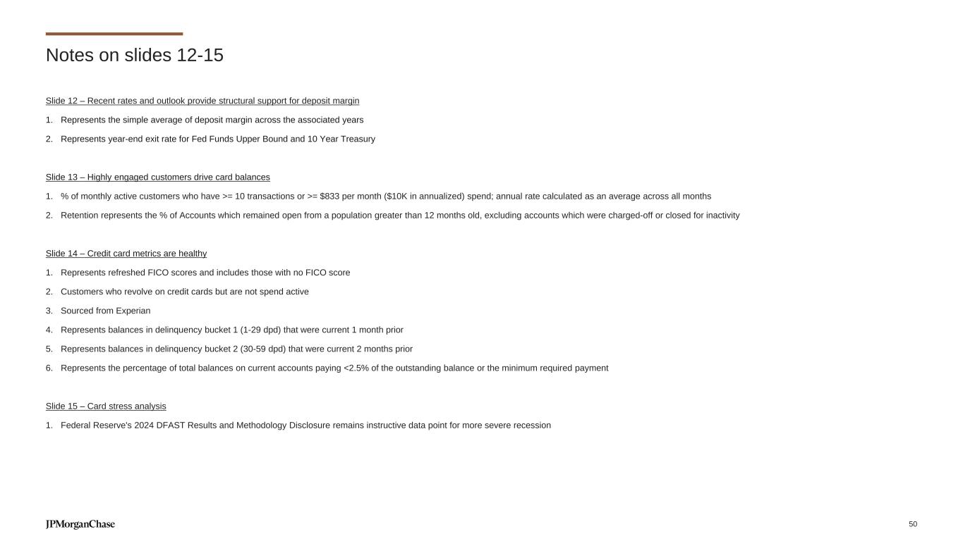 Slide 7 – Organic growth driving revenue 1. Prior period numbers have been revised to conform to current period presentation 2. Includes NII related to Home Lending, Auto, BWM loans and capital resource allocations Slide 8 – Revenue diversification is a source of strength 1. Includes NII related to Home Lending, Auto, BWM loans and capital resource allocations 2. % of internal yield seeking inflows (incl. J.P. Morgan Wealth Management flows, internal migration) of total measured yield seeking outflows (incl. J.P. Morgan Wealth Management flows, internal migration, external brokerages, online banks, crypto exchanges); excludes net new money Slide 9 – Consumers and small businesses remain financially healthy against a noisy backdrop 1. Share of consumers with a payroll disruption – weekly average through late-April vs. same period in 2024 2. As of April 2025; Cohort of credit card customers spend active in current month and same month last year, excluding accounts with limited tenure 3. Median cash buffer for a cohort of clients – YTD through April ‘25 vs. historic norms; Consumer cash buffers indicate the number of days of regular outflows that a consumer’s deposit balances can cover (checking and savings accounts, ex. CDs); Business cash buffers (measured in days) indicate the number of days a business can cover regular expenses using existing cash assets from demand deposit accounts without new income 4. University of Michigan consumer sentiment – April 2025 survey vs. December 2024 survey 5. Chase pulse survey of small businesses, change in the share optimistic about the future – April 2025 survey vs. December 2024 survey Slide 11 – Primary banking relationships drive deposit balance increases 1. Full year 2019 to 2024 CAGR 2. Represents net new accounts 3. Primary bank checking customers meet one of the following conditions: ≥15 withdrawals from a checking account or ≥5 withdrawals from a checking account & ≥$500 of inflows in a given month 4. Primary bank indicator based on account behaviors including account settlements (number and dollar volume of transactions), payroll processing, and digital activity. Prior reporting methodology (65%) had no client exclusions and reflected year-end values; methodology has been revised to exclude clients without revenue or primacy information, <4 months on book, and <$100K revenue, and reflects full-year average Notes on slides 7-11 49