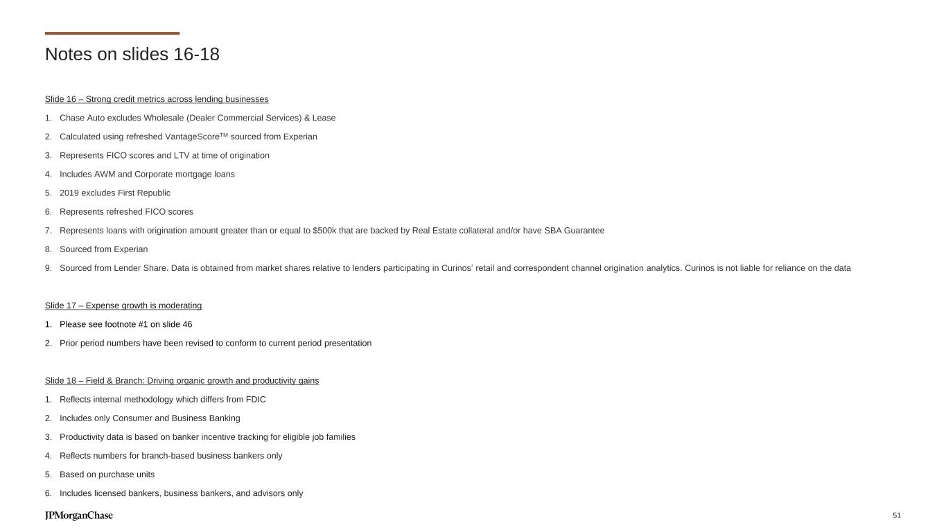 Slide 16 – Strong credit metrics across lending businesses 1. Chase Auto excludes Wholesale (Dealer Commercial Services) & Lease 2. Calculated using refreshed VantageScoreTM sourced from Experian 3. Represents FICO scores and LTV at time of origination 4. Includes AWM and Corporate mortgage loans 5. 2019 excludes First Republic 6. Represents refreshed FICO scores 7. Represents loans with origination amount greater than or equal to $500k that are backed by Real Estate collateral and/or have SBA Guarantee 8. Sourced from Experian 9. Sourced from Lender Share. Data is obtained from market shares relative to lenders participating in Curinos’ retail and correspondent channel origination analytics. Curinos is not liable for reliance on the data Slide 17 – Expense growth is moderating 1. Please see footnote #1 on slide 46 2. Prior period numbers have been revised to conform to current period presentation Slide 18 – Field & Branch: Driving organic growth and productivity gains 1. Reflects internal methodology which differs from FDIC 2. Includes only Consumer and Business Banking 3. Productivity data is based on banker incentive tracking for eligible job families 4. Reflects numbers for branch-based business bankers only 5. Based on purchase units 6. Includes licensed bankers, business bankers, and advisors only Notes on slides 16-18 51