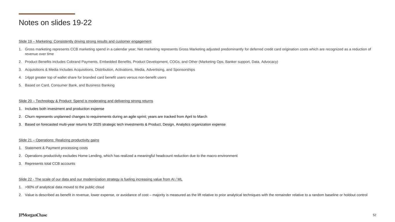 Slide 19 – Marketing: Consistently driving strong results and customer engagement 1. Gross marketing represents CCB marketing spend in a calendar year; Net marketing represents Gross Marketing adjusted predominantly for deferred credit card origination costs which are recognized as a reduction of revenue over time 2. Product Benefits includes Cobrand Payments, Embedded Benefits, Product Development, COGs, and Other (Marketing Ops, Banker support, Data, Advocacy) 3. Acquisitions & Media Includes Acquisitions, Distribution, Activations, Media, Advertising, and Sponsorships 4. 14ppt greater top of wallet share for branded card benefit users versus non-benefit users 5. Based on Card, Consumer Bank, and Business Banking Slide 20 – Technology & Product: Spend is moderating and delivering strong returns 1. Includes both investment and production expense 2. Churn represents unplanned changes to requirements during an agile sprint; years are tracked from April to March 3. Based on forecasted multi-year returns for 2025 strategic tech investments & Product, Design, Analytics organization expense Slide 21 – Operations: Realizing productivity gains 1. Statement & Payment processing costs 2. Operations productivity excludes Home Lending, which has realized a meaningful headcount reduction due to the macro environment 3. Represents total CCB accounts Slide 22 - The scale of our data and our modernization strategy is fueling increasing value from AI / ML 1. >90% of analytical data moved to the public cloud 2. Value is described as benefit in revenue, lower expense, or avoidance of cost – majority is measured as the lift relative to prior analytical techniques with the remainder relative to a random baseline or holdout control Notes on slides 19-22 52