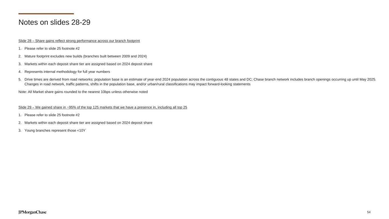 Slide 25 – CCB is a growth franchise 1. Net Promoter Score (NPS) is an indicator of customer satisfaction; represents Net Promoter Score gains over the last 5 years 2. Federal Deposit Insurance Corporation (FDIC) 2024 Summary of Deposits survey per S&P Global Market Intelligence applies a $1B deposit cap to Chase and industry branches for market share. While many of our branches have more than $1B in retail deposits, applying a cap consistently to ourselves and the industry is critical to the integrity of this measurement. Includes all commercial banks, savings banks and savings institutions as defined by the FDIC. Deposit market share and rankings are calculated with historical institutional ownership for each year stated; measured from July of start of period to June of end of period 3. OS Share reflects Ascend OS data, methodology changed from Investor Day 2024 which used Nilson OS data 4. Represents Branded credit card travel volumes addressable by our Travel platform (hotel, air, car rental, cruises) and debit and credit retail spend addressable by our Offers platform (ex. Oil and Gas); portions of Offers and Shopping volume data sourced from 3rd party partners 5. Includes LLR; 2019 ROE has been adjusted to reflect full impact of loan sales executed in 2019 of which partial impact was reported in Chief Investment Office Slide 26 – We’re continuously improving customer experiences across channels, products and experiences 1. Represents Net Promoter Score gains over the last 5 years 2. Represents customer satisfaction (CSAT); CSAT for financial tools represents Credit Journey 3. Represents advised relationships; Small businesses with revenue of more than $1mm and assigned to a business banker Slide 27 – Deposit and small business primary share gains outpace the competition 1. Please refer to slide 25 footnote #2 2. Barlow Research Associates, Primary Bank Market Share Database as of 4Q24. Rolling eight quarter average of small businesses with revenue of more than $100,000 and less than $25mm 3. Reflects number of newly formed businesses that open accounts with Chase divided by new business formations as reported by Census 4. Large clients defined as businesses with an annual sales size of $1mm-$25mm; Barlow Research Associates, Primary Bank Market Share as of Q4 of respective year. Rolling 8 Quarter Trending Data of small businesses with revenues of $100K-<$25mm Notes on slides 25-27 53