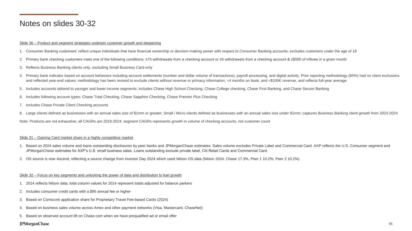Slide 30 – Product and segment strategies underpin customer growth and deepening 1. Consumer Banking customers’ reflect unique individuals that have financial ownership or decision-making power with respect to Consumer Banking accounts; excludes customers under the age of 18 2. Primary bank checking customers meet one of the following conditions: ≥15 withdrawals from a checking account or ≥5 withdrawals from a checking account & ≥$500 of inflows in a given month 3. Reflects Business Banking clients only, excluding Small Business Card-only 4. Primary bank indicator based on account behaviors including account settlements (number and dollar volume of transactions), payroll processing, and digital activity. Prior reporting methodology (65%) had no client exclusions and reflected year-end values; methodology has been revised to exclude clients without revenue or primacy information, <4 months on book, and <$100K revenue, and reflects full-year average 5. Includes accounts tailored to younger and lower-income segments; includes Chase High School Checking, Chase College checking, Chase First Banking, and Chase Secure Banking 6. Includes following account types: Chase Total Checking, Chase Sapphire Checking, Chase Premier Plus Checking 7. Includes Chase Private Client Checking accounts 8. Large clients defined as businesses with an annual sales size of $1mm or greater; Small / Micro clients defined as businesses with an annual sales size under $1mm; captures Business Banking client growth from 2023-2024 Note: Products are not exhaustive; all CAGRs are 2019-2024; segment CAGRs represents growth in volume of checking accounts, not customer count Slide 31 – Gaining Card market share in a highly competitive market 1. Based on 2024 sales volume and loans outstanding disclosures by peer banks and JPMorganChase estimates. Sales volume excludes Private Label and Commercial Card. AXP reflects the U.S. Consumer segment and JPMorganChase estimates for AXP’s U.S. small business sales. Loans outstanding exclude private label, Citi Retail Cards and Commercial Card. 2. OS source is now Ascend, reflecting a source change from Investor Day 2024 which used Nilson OS data (Nilson 2024: Chase 17.3%, Peer 1 10.2%, Peer 2 10.2%) Slide 32 – Focus on key segments and unlocking the power of data and distribution to fuel growth 1. 2014 reflects Nilson data; total column values for 2014 represent totals adjusted for balance parkers 2. Includes consumer credit cards with a $95 annual fee or higher 3. Based on Comscore application share for Proprietary Travel Fee-based Cards (2024) 4. Based on business sales volume across Amex and other payment networks (Visa, Mastercard, ChaseNet) 5. Based on observed account lift on Chase.com when we have prequalified ad or email offer Notes on slides 30-32 55