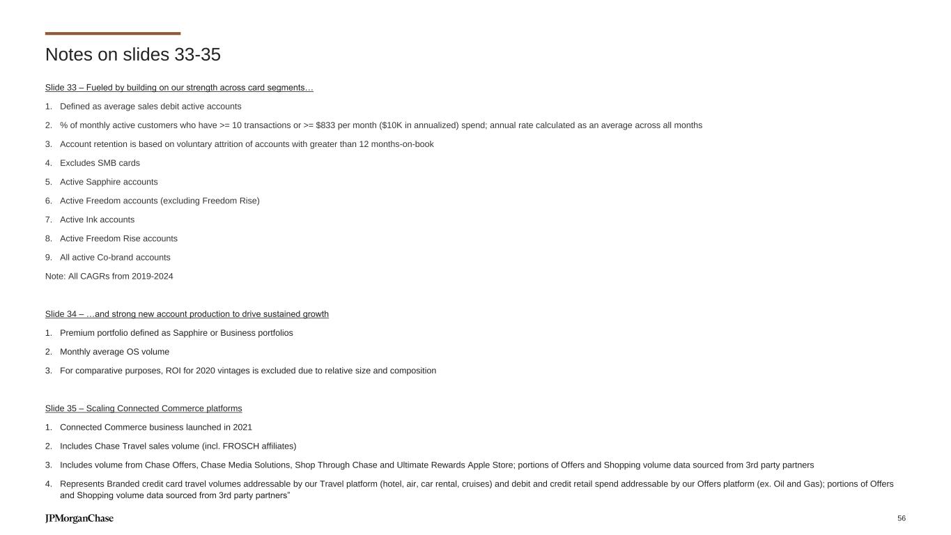 Slide 33 – Fueled by building on our strength across card segments… 1. Defined as average sales debit active accounts 2. % of monthly active customers who have >= 10 transactions or >= $833 per month ($10K in annualized) spend; annual rate calculated as an average across all months 3. Account retention is based on voluntary attrition of accounts with greater than 12 months-on-book 4. Excludes SMB cards 5. Active Sapphire accounts 6. Active Freedom accounts (excluding Freedom Rise) 7. Active Ink accounts 8. Active Freedom Rise accounts 9. All active Co-brand accounts Note: All CAGRs from 2019-2024 Slide 34 – …and strong new account production to drive sustained growth 1. Premium portfolio defined as Sapphire or Business portfolios 2. Monthly average OS volume 3. For comparative purposes, ROI for 2020 vintages is excluded due to relative size and composition Slide 35 – Scaling Connected Commerce platforms 1. Connected Commerce business launched in 2021 2. Includes Chase Travel sales volume (incl. FROSCH affiliates) 3. Includes volume from Chase Offers, Chase Media Solutions, Shop Through Chase and Ultimate Rewards Apple Store; portions of Offers and Shopping volume data sourced from 3rd party partners 4. Represents Branded credit card travel volumes addressable by our Travel platform (hotel, air, car rental, cruises) and debit and credit retail spend addressable by our Offers platform (ex. Oil and Gas); portions of Offers and Shopping volume data sourced from 3rd party partners” Notes on slides 33-35 56