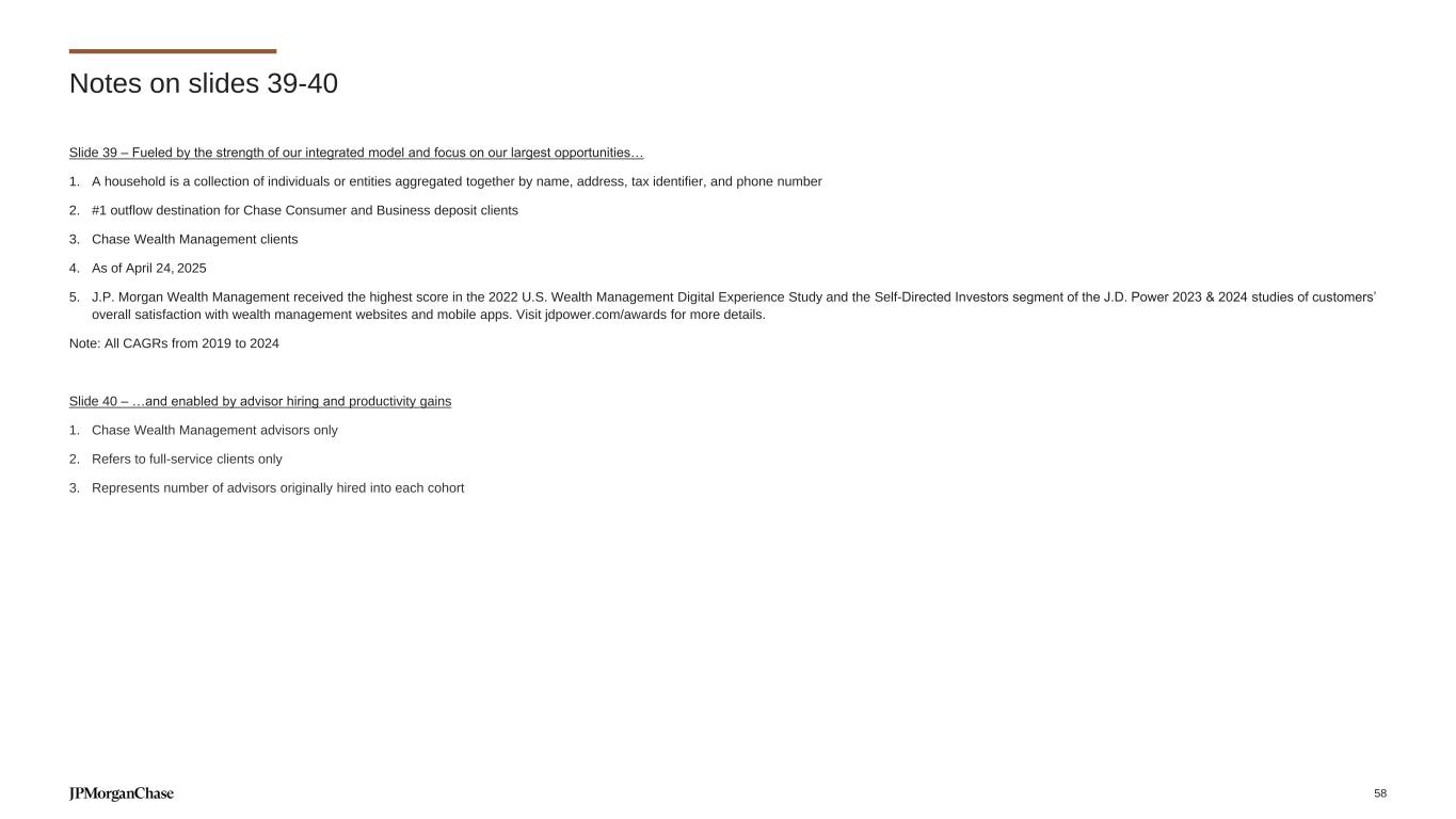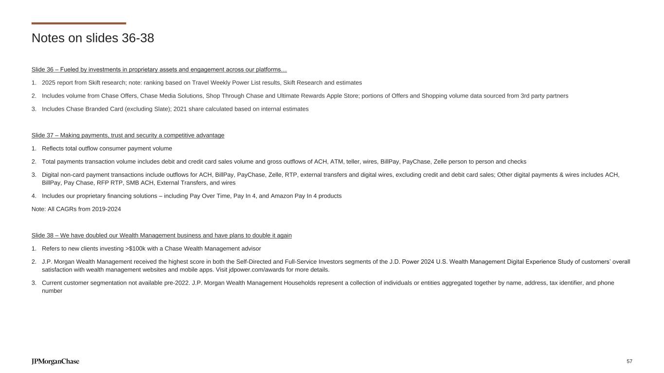 Slide 36 – Fueled by investments in proprietary assets and engagement across our platforms… 1. 2025 report from Skift research; note: ranking based on Travel Weekly Power List results, Skift Research and estimates 2. Includes volume from Chase Offers, Chase Media Solutions, Shop Through Chase and Ultimate Rewards Apple Store; portions of Offers and Shopping volume data sourced from 3rd party partners 3. Includes Chase Branded Card (excluding Slate); 2021 share calculated based on internal estimates Slide 37 – Making payments, trust and security a competitive advantage 1. Reflects total outflow consumer payment volume 2. Total payments transaction volume includes debit and credit card sales volume and gross outflows of ACH, ATM, teller, wires, BillPay, PayChase, Zelle person to person and checks 3. Digital non-card payment transactions include outflows for ACH, BillPay, PayChase, Zelle, RTP, external transfers and digital wires, excluding credit and debit card sales; Other digital payments & wires includes ACH, BillPay, Pay Chase, RFP RTP, SMB ACH, External Transfers, and wires 4. Includes our proprietary financing solutions – including Pay Over Time, Pay In 4, and Amazon Pay In 4 products Note: All CAGRs from 2019-2024 Slide 38 – We have doubled our Wealth Management business and have plans to double it again 1. Refers to new clients investing >$100k with a Chase Wealth Management advisor 2. J.P. Morgan Wealth Management received the highest score in both the Self-Directed and Full-Service Investors segments of the J.D. Power 2024 U.S. Wealth Management Digital Experience Study of customers’ overall satisfaction with wealth management websites and mobile apps. Visit jdpower.com/awards for more details. 3. Current customer segmentation not available pre-2022. J.P. Morgan Wealth Management Households represent a collection of individuals or entities aggregated together by name, address, tax identifier, and phone number Notes on slides 36-38 57
