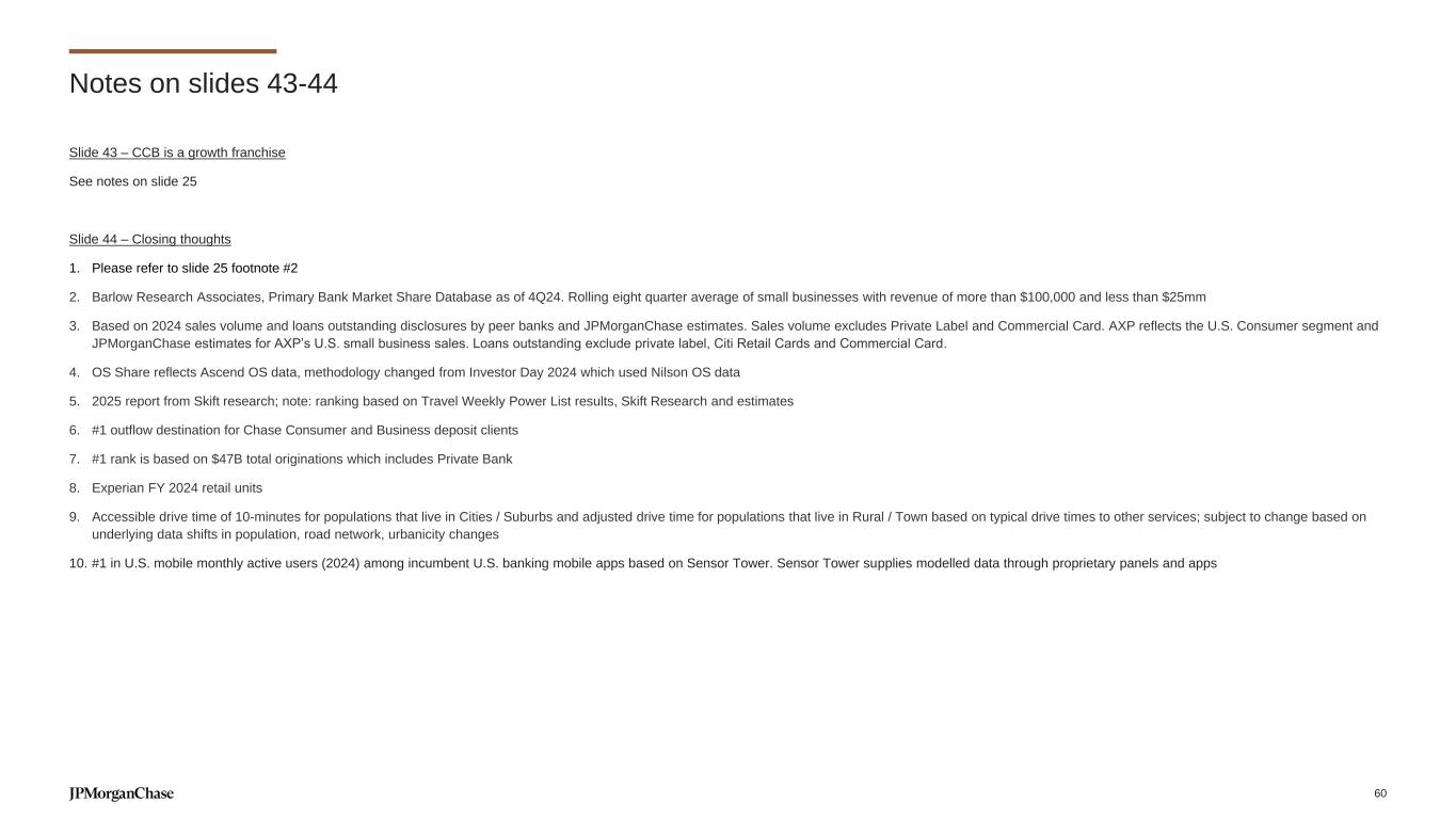Slide 43 – CCB is a growth franchise See notes on slide 25 Slide 44 – Closing thoughts 1. Please refer to slide 25 footnote #2 2. Barlow Research Associates, Primary Bank Market Share Database as of 4Q24. Rolling eight quarter average of small businesses with revenue of more than $100,000 and less than $25mm 3. Based on 2024 sales volume and loans outstanding disclosures by peer banks and JPMorganChase estimates. Sales volume excludes Private Label and Commercial Card. AXP reflects the U.S. Consumer segment and JPMorganChase estimates for AXP’s U.S. small business sales. Loans outstanding exclude private label, Citi Retail Cards and Commercial Card. 4. OS Share reflects Ascend OS data, methodology changed from Investor Day 2024 which used Nilson OS data 5. 2025 report from Skift research; note: ranking based on Travel Weekly Power List results, Skift Research and estimates 6. #1 outflow destination for Chase Consumer and Business deposit clients 7. #1 rank is based on $47B total originations which includes Private Bank 8. Experian FY 2024 retail units 9. Accessible drive time of 10-minutes for populations that live in Cities / Suburbs and adjusted drive time for populations that live in Rural / Town based on typical drive times to other services; subject to change based on underlying data shifts in population, road network, urbanicity changes 10. #1 in U.S. mobile monthly active users (2024) among incumbent U.S. banking mobile apps based on Sensor Tower. Sensor Tower supplies modelled data through proprietary panels and apps Notes on slides 43-44 60
