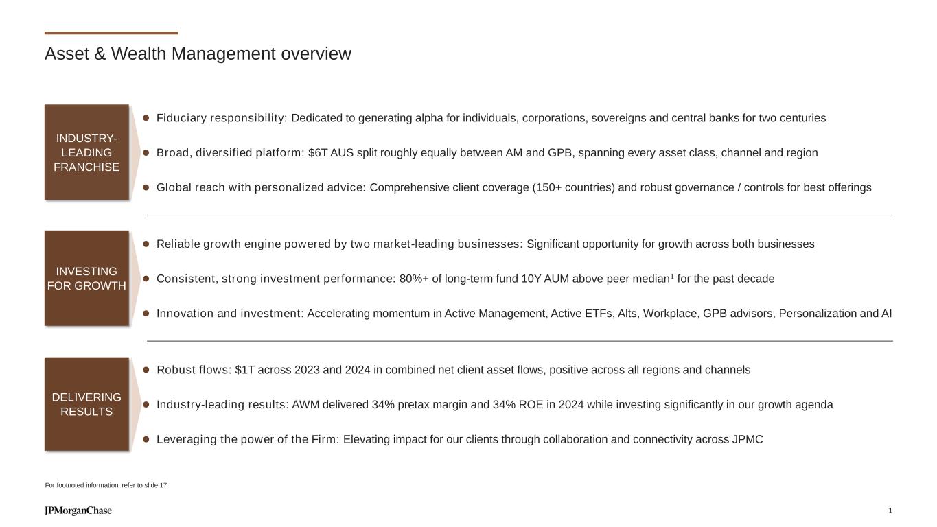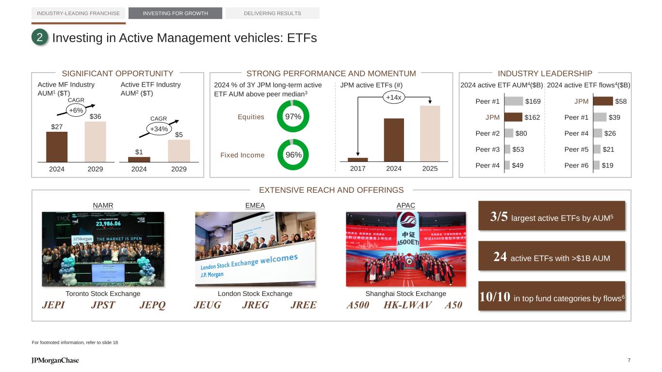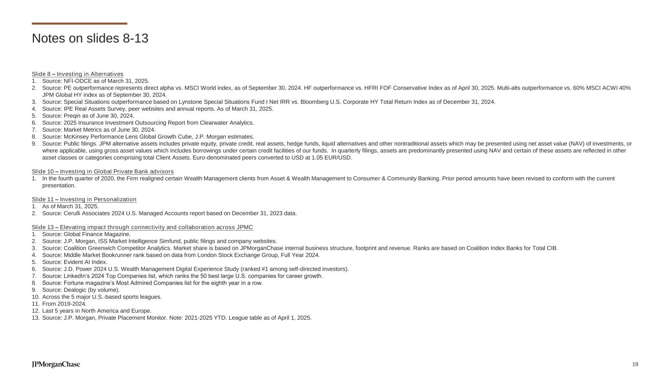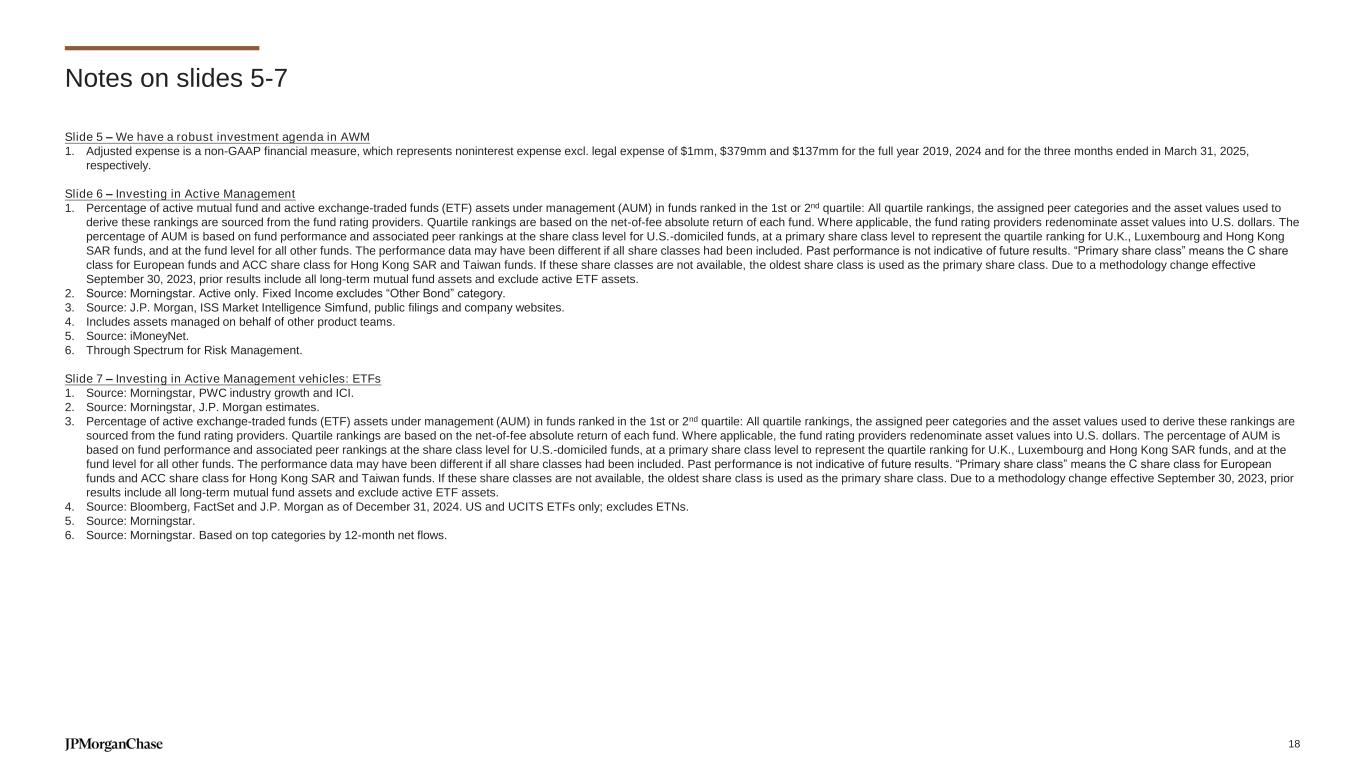 Notes on slides 5-7 Slide 5 – We have a robust investment agenda in AWM 1. Adjusted expense is a non-GAAP financial measure, which represents noninterest expense excl. legal expense of $1mm, $379mm and $137mm for the full year 2019, 2024 and for the three months ended in March 31, 2025, respectively. Slide 6 – Investing in Active Management 1. Percentage of active mutual fund and active exchange-traded funds (ETF) assets under management (AUM) in funds ranked in the 1st or 2nd quartile: All quartile rankings, the assigned peer categories and the asset values used to derive these rankings are sourced from the fund rating providers. Quartile rankings are based on the net-of-fee absolute return of each fund. Where applicable, the fund rating providers redenominate asset values into U.S. dollars. The percentage of AUM is based on fund performance and associated peer rankings at the share class level for U.S.-domiciled funds, at a primary share class level to represent the quartile ranking for U.K., Luxembourg and Hong Kong SAR funds, and at the fund level for all other funds. The performance data may have been different if all share classes had been included. Past performance is not indicative of future results. “Primary share class” means the C share class for European funds and ACC share class for Hong Kong SAR and Taiwan funds. If these share classes are not available, the oldest share class is used as the primary share class. Due to a methodology change effective September 30, 2023, prior results include all long-term mutual fund assets and exclude active ETF assets. 2. Source: Morningstar. Active only. Fixed Income excludes “Other Bond” category. 3. Source: J.P. Morgan, ISS Market Intelligence Simfund, public filings and company websites. 4. Includes assets managed on behalf of other product teams. 5. Source: iMoneyNet. 6. Through Spectrum for Risk Management. Slide 7 – Investing in Active Management vehicles: ETFs 1. Source: Morningstar, PWC industry growth and ICI. 2. Source: Morningstar, J.P. Morgan estimates. 3. Percentage of active exchange-traded funds (ETF) assets under management (AUM) in funds ranked in the 1st or 2nd quartile: All quartile rankings, the assigned peer categories and the asset values used to derive these rankings are sourced from the fund rating providers. Quartile rankings are based on the net-of-fee absolute return of each fund. Where applicable, the fund rating providers redenominate asset values into U.S. dollars. The percentage of AUM is based on fund performance and associated peer rankings at the share class level for U.S.-domiciled funds, at a primary share class level to represent the quartile ranking for U.K., Luxembourg and Hong Kong SAR funds, and at the fund level for all other funds. The performance data may have been different if all share classes had been included. Past performance is not indicative of future results. “Primary share class” means the C share class for European funds and ACC share class for Hong Kong SAR and Taiwan funds. If these share classes are not available, the oldest share class is used as the primary share class. Due to a methodology change effective September 30, 2023, prior results include all long-term mutual fund assets and exclude active ETF assets. 4. Source: Bloomberg, FactSet and J.P. Morgan as of December 31, 2024. US and UCITS ETFs only; excludes ETNs. 5. Source: Morningstar. 6. Source: Morningstar. Based on top categories by 12-month net flows. 18