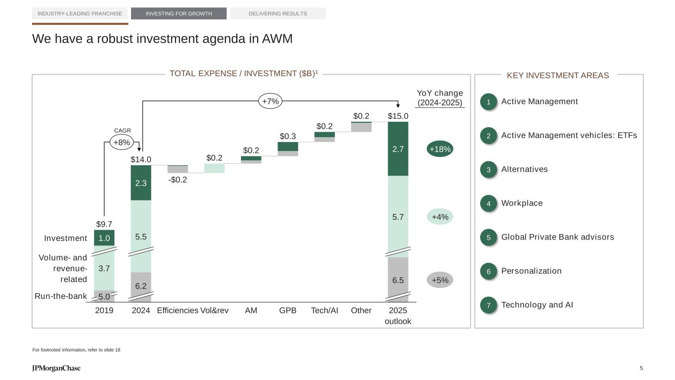 ...with a significant opportunity for long-term growth INDUSTRY-LEADING FRANCHISE INVESTING FOR GROWTH DELIVERING RESULTS 2019 2024 $3.1 $5.9 Client assets ($T) JPM AUS market share2 Global Private Bank1 Asset Management 9% 4% Active asset management industry revenue3 ($B) 2019 2024 $378 $495 9% Total private banking industry revenue3 ($B) 2019 2024 $93 $128 MARKET-LEADING POSITION WITH OPPORTUNITY FOR FUTURE GROWTH Revenue ($B) 2% 2030+ growth opportunities for AWM Equities $2.0T AUM $1T today Fixed Income $1.5T AUM $1T today4 Active ETFs $1.0T AUM $162B today Global Private Bank $5.0T AUS $3T today Alternatives $1.0T gross assets $575B today5 JPM rev. market share For footnoted information, refer to slide 17 4
