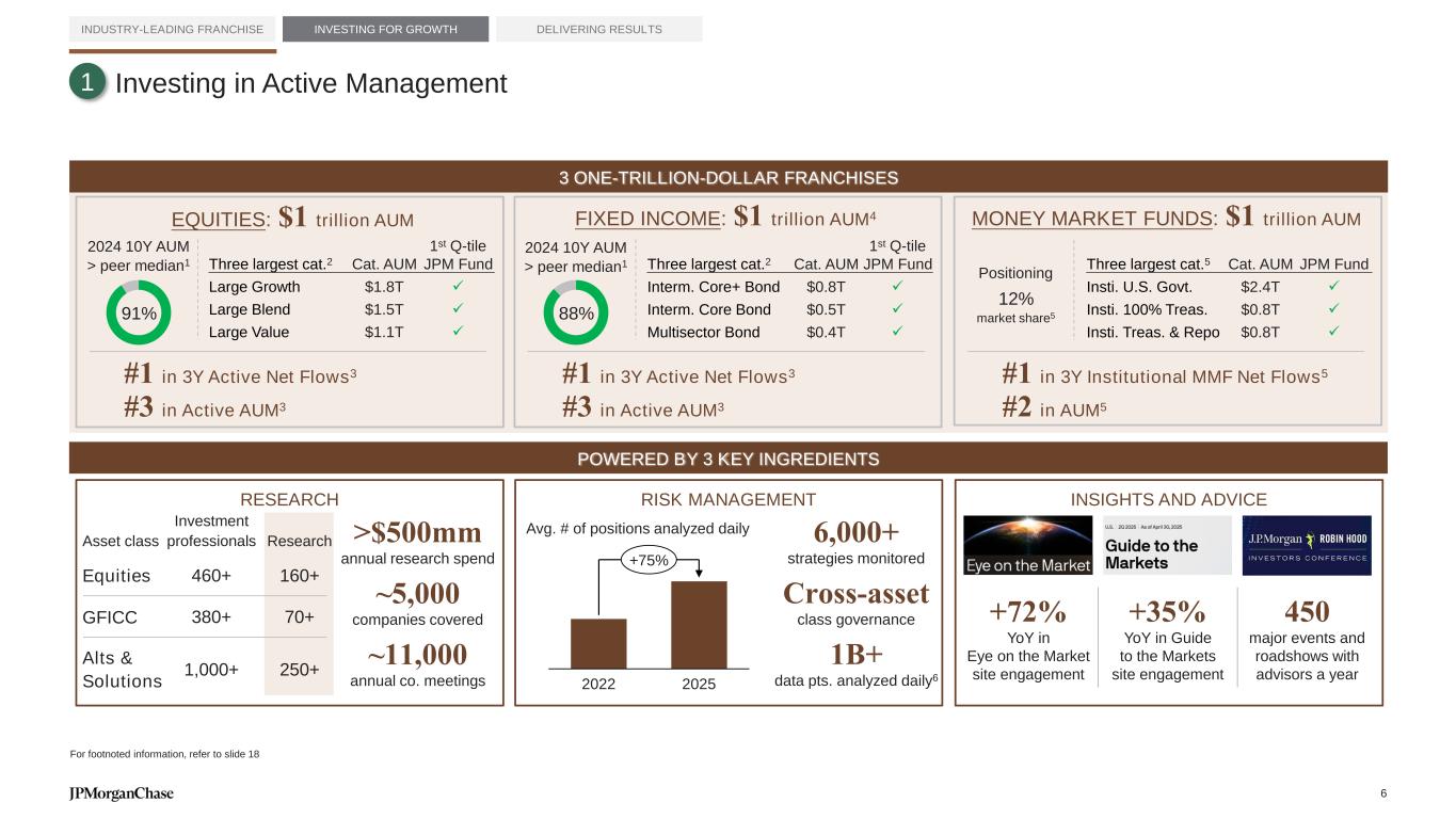 Investing in Active Management INDUSTRY-LEADING FRANCHISE INVESTING FOR GROWTH DELIVERING RESULTS For footnoted information, refer to slide 18 3 ONE-TRILLION-DOLLAR FRANCHISES EQUITIES: $1 trillion AUM Three largest cat.2 Cat. AUM 1st Q-tile JPM Fund Large Growth $1.8T ✓ Large Blend $1.5T ✓ Large Value $1.1T ✓ 91% #1 in 3Y Active Net Flows3 #1 in 3Y Institutional MMF Net Flows5 88% Three largest cat.2 Cat. AUM 1st Q-tile JPM Fund Interm. Core+ Bond $0.8T ✓ Interm. Core Bond $0.5T ✓ Multisector Bond $0.4T ✓ 2024 10Y AUM > peer median1 2024 10Y AUM > peer median1 Positioning 12% market share5 Three largest cat.5 Cat. AUM JPM Fund Insti. U.S. Govt. $2.4T ✓ Insti. 100% Treas. $0.8T ✓ Insti. Treas. & Repo $0.8T ✓ #3 in Active AUM3 #3 in Active AUM3 #2 in AUM5 2022 2025 +75% Avg. # of positions analyzed daily Asset class Investment professionals Research Equities 460+ 160+ GFICC 380+ 70+ Alts & Solutions 1,000+ 250+ >$500mm annual research spend ~11,000 annual co. meetings ~5,000 companies covered 1B+ data pts. analyzed daily6 6,000+ strategies monitored Cross-asset class governance RESEARCH RISK MANAGEMENT INSIGHTS AND ADVICE #1 in 3Y Active Net Flows3 FIXED INCOME: $1 trillion AUM4 MONEY MARKET FUNDS: $1 trillion AUM POWERED BY 3 KEY INGREDIENTS 1 +72% YoY in Eye on the Market site engagement +35% YoY in Guide to the Markets site engagement 450 major events and roadshows with advisors a year 6