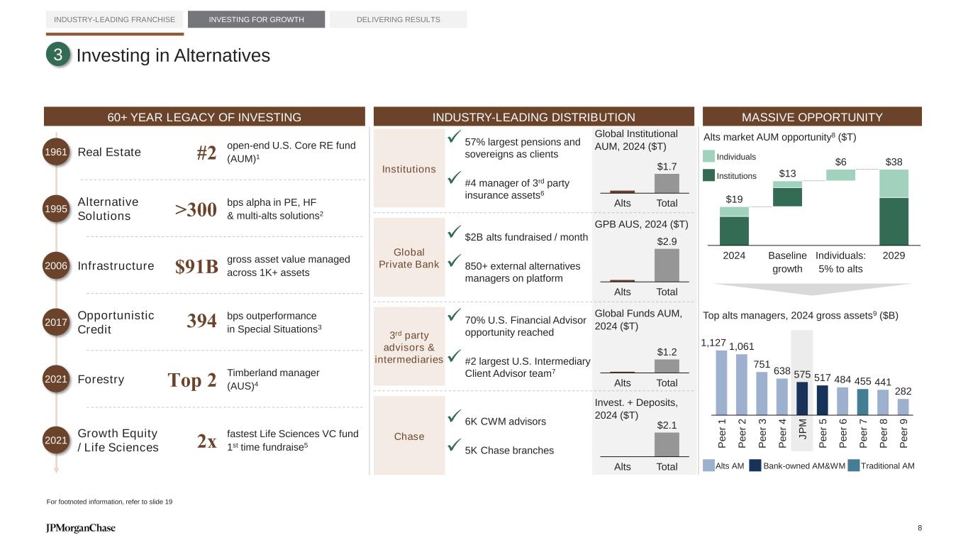 INDUSTRY LEADERSHIP Investing in Active Management vehicles: ETFs INDUSTRY-LEADING FRANCHISE INVESTING FOR GROWTH DELIVERING RESULTS NAMR Equities Fixed Income JPM active ETFs (#) 2017 2024 2025 +14x 2024 2029 $1 $5 +34% Active MF Industry AUM1 ($T) EMEA APAC 2024 % of 3Y JPM long-term active ETF AUM above peer median3 3/5 largest active ETFs by AUM5 24 active ETFs with >$1B AUM 10/10 in top fund categories by flows6 For footnoted information, refer to slide 18 SIGNIFICANT OPPORTUNITY STRONG PERFORMANCE AND MOMENTUM 97% 96% Peer #1 JPM Peer #2 Peer #3 Peer #4 $169 $162 $80 $53 $49 2024 2029 $27 $36 +6% Active ETF Industry AUM2 ($T) 2024 active ETF AUM4($B) JPM Peer #1 Peer #4 Peer #5 Peer #6 $58 $39 $26 $21 $19 2024 active ETF flows4($B) EXTENSIVE REACH AND OFFERINGS JEPI JPST JEPQ JEUG JREG JREE HK-LWAVA500 A50 2 CAGR CAGR Toronto Stock Exchange London Stock Exchange Shanghai Stock Exchange 7