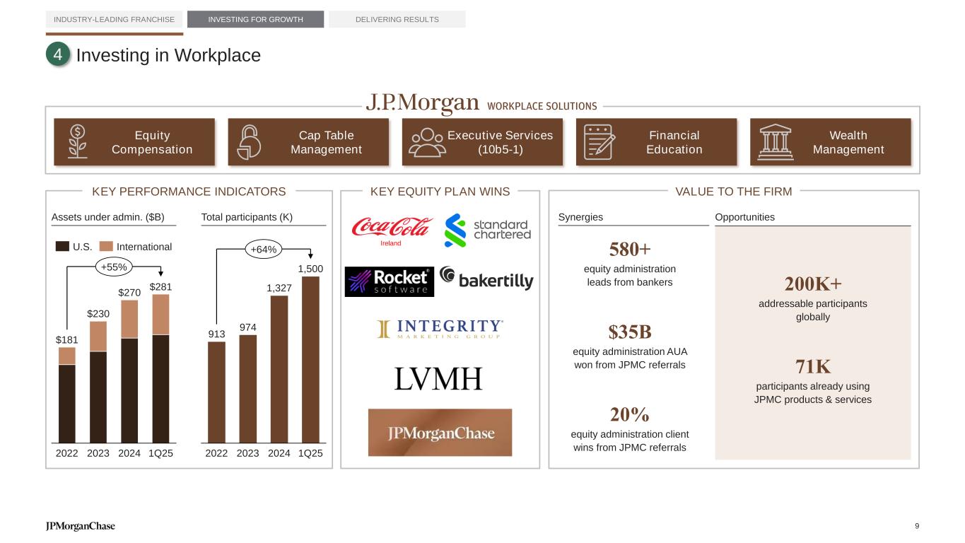 Investing in Workplace INDUSTRY-LEADING FRANCHISE INVESTING FOR GROWTH DELIVERING RESULTS Ireland 200K+ addressable participants globally 71K participants already using JPMC products & services 580+ equity administration leads from bankers 2022 2023 2024 1Q25 $181 $230 $270 $281 +55% 913 974 1,327 1,500 2022 2023 2024 1Q25 +64%U.S. International Assets under admin. ($B) Total participants (K) Equity Compensation Cap Table Management Executive Services (10b5-1) Financial Education Wealth Management $35B equity administration AUA won from JPMC referrals 20% equity administration client wins from JPMC referrals Synergies Opportunities 4 KEY PERFORMANCE INDICATORS KEY EQUITY PLAN WINS VALUE TO THE FIRM 9