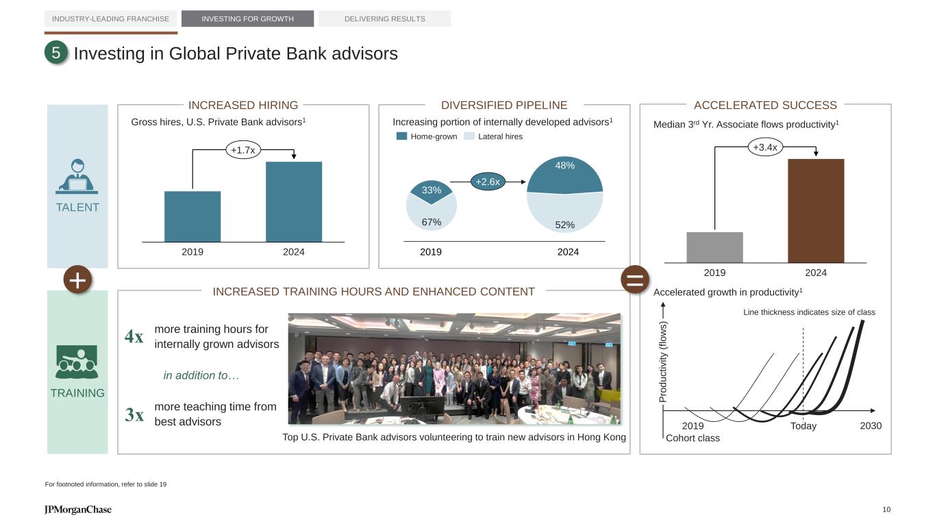 TALENT TRAINING Investing in Global Private Bank advisors INDUSTRY-LEADING FRANCHISE INVESTING FOR GROWTH DELIVERING RESULTS Gross hires, U.S. Private Bank advisors1 Top U.S. Private Bank advisors volunteering to train new advisors in Hong Kong 2019 2024 +1.7x 2019 2024 +3.4x Median 3rd Yr. Associate flows productivity1 + Increasing portion of internally developed advisors1 67% 33% 52% 48% 2019 2024 +2.6x Home-grown Lateral hires 3x 4x more training hours for internally grown advisors INCREASED TRAINING HOURS AND ENHANCED CONTENT more teaching time from best advisors DIVERSIFIED PIPELINEINCREASED HIRING = ACCELERATED SUCCESS Accelerated growth in productivity1 P ro d u c ti v it y ( fl o w s ) 20302019 Line thickness indicates size of class 5 Today Cohort class For footnoted information, refer to slide 19 in addition to… 10