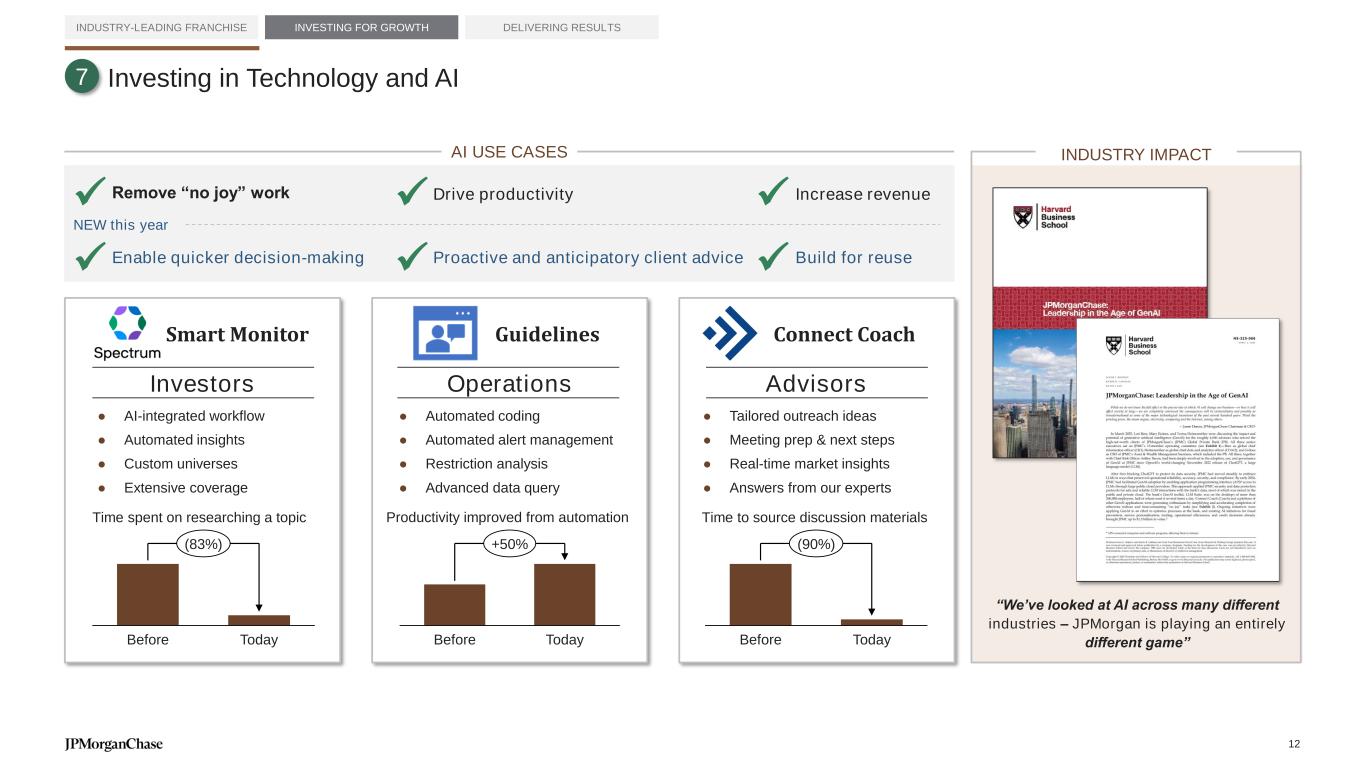 ● Automated coding ● Automated alert management ● Restriction analysis ● Advanced data query Investing in Technology and AI Guidelines Remove “no joy” work Drive productivity Increase revenue NEW this year Proactive and anticipatory client adviceEnable quicker decision-making Build for reuse “We’ve looked at AI across many different industries – JPMorgan is playing an entirely different game” INDUSTRY IMPACT AdvisorsInvestors Operations ● Tailored outreach ideas ● Meeting prep & next steps ● Real-time market insights ● Answers from our experts ● AI-integrated workflow ● Automated insights ● Custom universes ● Extensive coverage Before Today (90%) Before Today +50% Before Today (83%) Time spent on researching a topic Productivity improved from automation Time to source discussion materials INDUSTRY-LEADING FRANCHISE INVESTING FOR GROWTH DELIVERING RESULTS 7 AI USE CASES ✓ ✓ ✓ ✓ ✓ ✓ Connect Coach 12 Smart Monitor