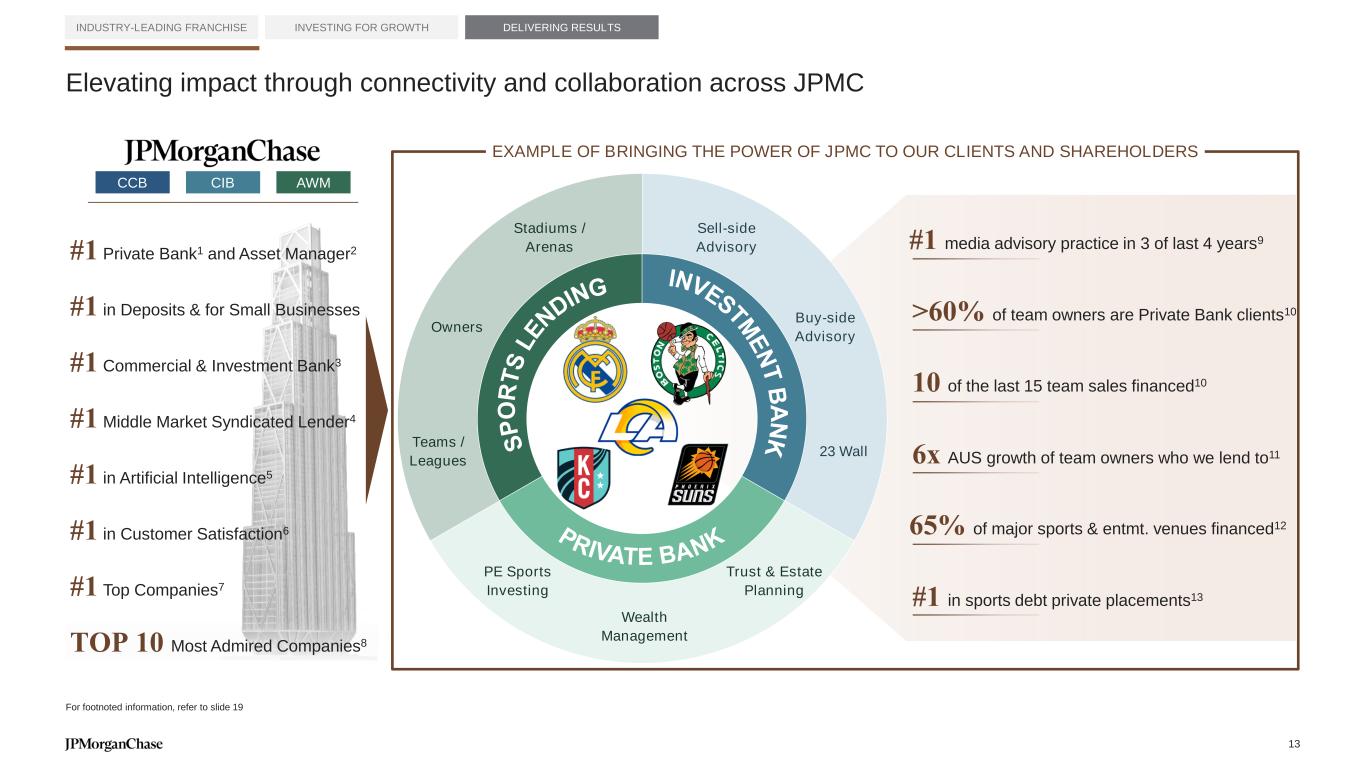 EXAMPLE OF BRINGING THE POWER OF JPMC TO OUR CLIENTS AND SHAREHOLDERS INDUSTRY LEADING FRANCHISE INVESTING FOR GROWTH DELIVERING RESULTS Elevating impact through connectivity and collaboration across JPMC #1 in Deposits & for Small Businesses #1 Commercial & Investment Bank3 #1 Private Bank1 and Asset Manager2 #1 in Customer Satisfaction6 #1 Middle Market Syndicated Lender4 #1 in Artificial Intelligence5 #1 Top Companies7 TOP 10 Most Admired Companies8 CCB CIB AWM INVESTM E N T B A N KS P O R T S L E N DING Owners Stadiums / Arenas Teams / Leagues Buy-side Advisory Sell-side Advisory PE Sports Investing Wealth Management Trust & Estate Planning 23 Wall PRIVATE BANK For footnoted information, refer to slide 19 13 - #1 in sports debt private placements13 >60% of team owners are Private Bank clients10 6x AUS growth of team owners who we lend to11 #1 media advisory practice in 3 of last 4 years9 10 of the last 15 team sales financed10 65% of major sports & entmt. venues financed12