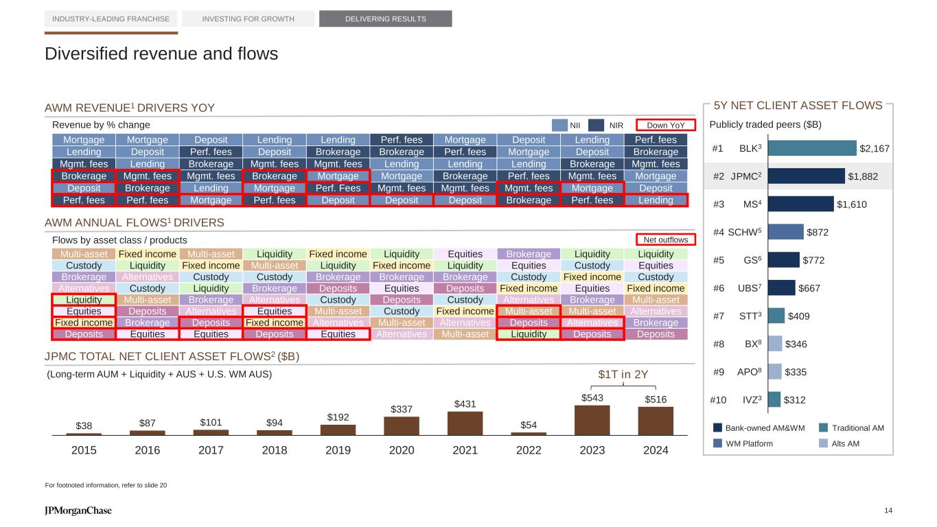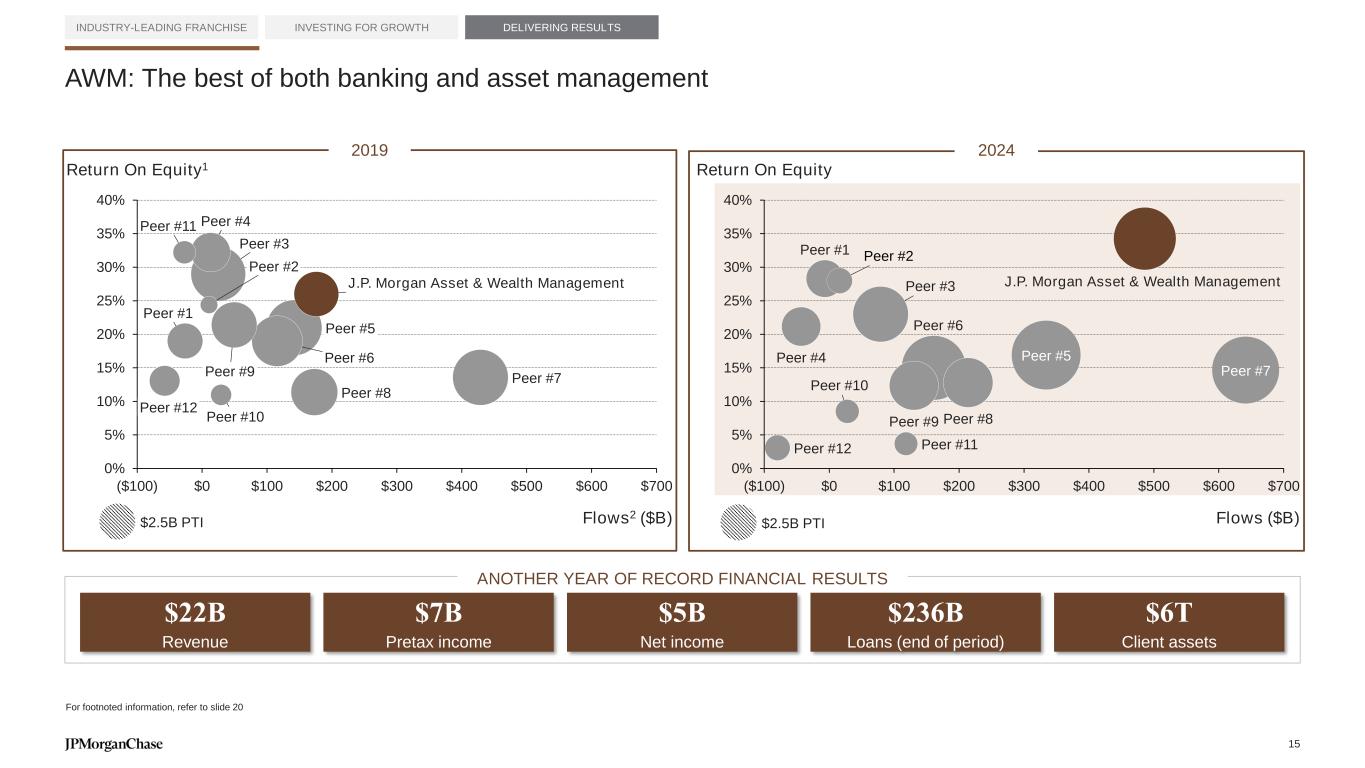 Mortgage Mortgage Deposit Lending Lending Perf. fees Mortgage Deposit Lending Perf. fees Lending Deposit Perf. fees Deposit Brokerage Brokerage Perf. fees Mortgage Deposit Brokerage Mgmt. fees Lending Brokerage Mgmt. fees Mgmt. fees Lending Lending Lending Brokerage Mgmt. fees Brokerage Mgmt. fees Mgmt. fees Brokerage Mortgage Mortgage Brokerage Perf. fees Mgmt. fees Mortgage Deposit Brokerage Lending Mortgage Perf. Fees Mgmt. fees Mgmt. fees Mgmt. fees Mortgage Deposit Perf. fees Perf. fees Mortgage Perf. fees Deposit Deposit Deposit Brokerage Perf. fees Lending Revenue by % change AWM REVENUE1 DRIVERS YOY $2,167 $1,882 $1,610 $872 $772 $667 $409 $346 $335 $312 BLK3 JPMC2 MS4 SCHW5 GS6 UBS7 STT3 BX8 APO8 IVZ3 Multi-asset Fixed income Multi-asset Liquidity Fixed income Liquidity Equities Brokerage Liquidity Liquidity Custody Liquidity Fixed income Multi-asset Liquidity Fixed income Liquidity Equities Custody Equities Brokerage Alternatives Custody Custody Brokerage Brokerage Brokerage Custody Fixed income Custody Alternatives Custody Liquidity Brokerage Deposits Equities Deposits Fixed income Equities Fixed income Liquidity Multi-asset Brokerage Alternatives Custody Deposits Custody Alternatives Brokerage Multi-asset Equities Deposits Alternatives Equities Multi-asset Custody Fixed income Multi-asset Multi-asset Alternatives Fixed income Brokerage Deposits Fixed income Alternatives Multi-asset Alternatives Deposits Alternatives Brokerage Deposits Equities Equities Deposits Equities Alternatives Multi-asset Liquidity Deposits Deposits JPMC TOTAL NET CLIENT ASSET FLOWS2 ($B) AWM ANNUAL FLOWS1 DRIVERS $38 $87 $101 $94 $192 $337 $431 $54 $543 $516 Diversified revenue and flows INDUSTRY-LEADING FRANCHISE INVESTING FOR GROWTH DELIVERING RESULTS NII NIR 5Y NET CLIENT ASSET FLOWS Flows by asset class / products (Long-term AUM + Liquidity + AUS + U.S. WM AUS) Publicly traded peers ($B) #1 #2 #3 #4 #5 #6 #7 #8 #9 #10 $1T in 2Y For footnoted information, refer to slide 20 Down YoY Net outflows 2015 2016 2017 2018 2019 2020 2021 2022 2023 2024 Traditional AM Alts AM Bank-owned AM&WM WM Platform 14