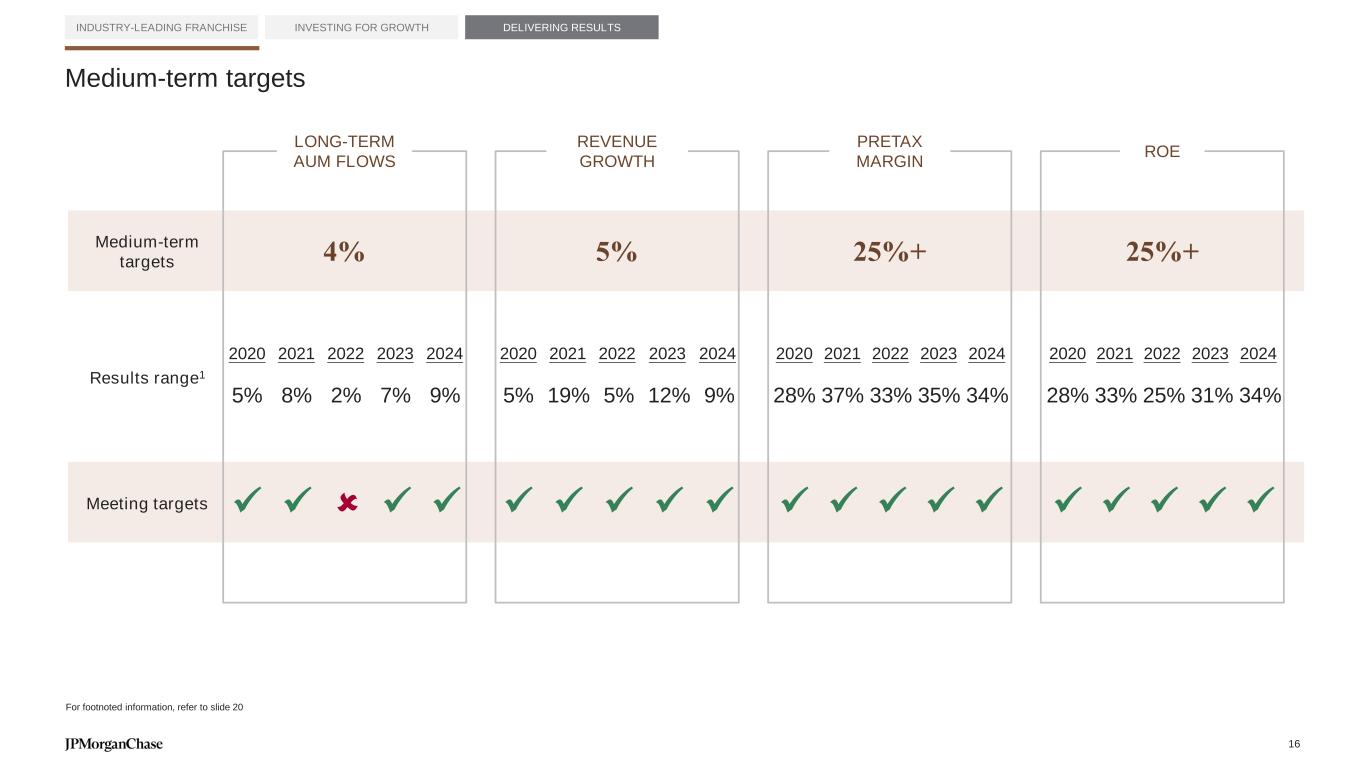 0% 5% 10% 15% 20% 25% 30% 35% 40% ($100) $0 $100 $200 $300 $400 $500 $600 $700 Peer #9 Peer #10 Return On Equity Peer #11Peer #12 J.P. Morgan Asset & Wealth Management Peer #1 Peer #2 Peer #3 Peer #4 Peer #5 Flows ($B) Peer #7 Peer #8 Peer #6 AWM: The best of both banking and asset management INDUSTRY-LEADING FRANCHISE INVESTING FOR GROWTH DELIVERING RESULTS $2.5B PTI 0% 5% 10% 15% 20% 25% 30% 35% 40% $300($100) $0 $100 $200 $400 $500 $600 $700 Peer #10 J.P. Morgan Asset & Wealth Management Peer #11 Peer #1 Peer #2 Peer #4 Peer #5 Flows2 ($B) Return On Equity1 Peer #3 Peer #7 Peer #8 Peer #9 Peer #6 Peer #12 $2.5B PTI 2024 ANOTHER YEAR OF RECORD FINANCIAL RESULTS $7B Pretax income $5B Net income $22B Revenue $236B Loans (end of period) $6T Client assets 2019 For footnoted information, refer to slide 20 15