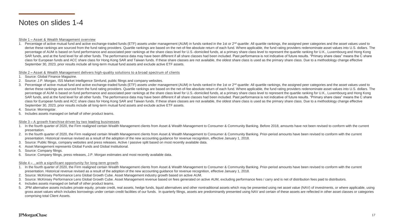 Notes on slides 1-4 Slide 1 – Asset & Wealth Management overview 1. Percentage of active mutual fund and active exchange-traded funds (ETF) assets under management (AUM) in funds ranked in the 1st or 2nd quartile: All quartile rankings, the assigned peer categories and the asset values used to derive these rankings are sourced from the fund rating providers. Quartile rankings are based on the net-of-fee absolute return of each fund. Where applicable, the fund rating providers redenominate asset values into U.S. dollars. The percentage of AUM is based on fund performance and associated peer rankings at the share class level for U.S.-domiciled funds, at a primary share class level to represent the quartile ranking for U.K., Luxembourg and Hong Kong SAR funds, and at the fund level for all other funds. The performance data may have been different if all share classes had been included. Past performance is not indicative of future results. “Primary share class” means the C share class for European funds and ACC share class for Hong Kong SAR and Taiwan funds. If these share classes are not available, the oldest share class is used as the primary share class. Due to a methodology change effective September 30, 2023, prior results include all long-term mutual fund assets and exclude active ETF assets. Slide 2 – Asset & Wealth Management delivers high-quality solutions to a broad spectrum of clients 1. Source: Global Finance Magazine. 2. Source: J.P. Morgan, ISS Market Intelligence Simfund, public filings and company websites. 3. Percentage of active mutual fund and active exchange-traded funds (ETF) assets under management (AUM) in funds ranked in the 1st or 2nd quartile: All quartile rankings, the assigned peer categories and the asset values used to derive these rankings are sourced from the fund rating providers. Quartile rankings are based on the net-of-fee absolute return of each fund. Where applicable, the fund rating providers redenominate asset values into U.S. dollars. The percentage of AUM is based on fund performance and associated peer rankings at the share class level for U.S.-domiciled funds, at a primary share class level to represent the quartile ranking for U.K., Luxembourg and Hong Kong SAR funds, and at the fund level for all other funds. The performance data may have been different if all share classes had been included. Past performance is not indicative of future results. “Primary share class” means the C share class for European funds and ACC share class for Hong Kong SAR and Taiwan funds. If these share classes are not available, the oldest share class is used as the primary share class. Due to a methodology change effective September 30, 2023, prior results include all long-term mutual fund assets and exclude active ETF assets. 4. Source: Morningstar. 5. Includes assets managed on behalf of other product teams. Slide 3 – A growth franchise driven by two leading businesses 1. In the fourth quarter of 2020, the Firm realigned certain Wealth Management clients from Asset & Wealth Management to Consumer & Community Banking. Before 2018, amounts have not been revised to conform with the current presentation. 2. In the fourth quarter of 2020, the Firm realigned certain Wealth Management clients from Asset & Wealth Management to Consumer & Community Banking. Prior-period amounts have been revised to conform with the current presentation. Historical revenue revised as a result of the adoption of the new accounting guidance for revenue recognition, effective January 1, 2018. 3. Source: Public filings, company websites and press releases. Active / passive split based on most recently available data. 4. Asset Management represents Global Funds and Global Institutional. 5. Source: Company filings. 6. Source: Company filings, press releases, J.P. Morgan estimates and most recently available data. Slide 4 – ...with a significant opportunity for long-term growth 1. In the fourth quarter of 2020, the Firm realigned certain Wealth Management clients from Asset & Wealth Management to Consumer & Community Banking. Prior-period amounts have been revised to conform with the current presentation. Historical revenue revised as a result of the adoption of the new accounting guidance for revenue recognition, effective January 1, 2018. 2. Source: McKinsey Performance Lens Global Growth Cube. Asset Management industry growth based on active AUM. 3. Source: McKinsey Performance Lens Global Growth Cube. Asset Management revenue based on fees generated on active AUM, excluding performance fees / carry and is net of distribution fees paid to distributors. 4. Includes assets managed on behalf of other product teams. 5. JPM alternative assets includes private equity, private credit, real assets, hedge funds, liquid alternatives and other nontraditional assets which may be presented using net asset value (NAV) of investments, or where applicable, using gross asset values which includes borrowings under certain credit facilities of our funds. In quarterly filings, assets are predominantly presented using NAV and certain of these assets are reflected in other asset classes or categories comprising total Client Assets. 17