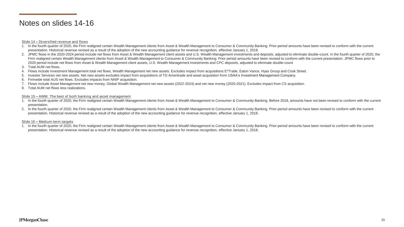 Notes on slides 14-16 Slide 14 – Diversified revenue and flows 1. In the fourth quarter of 2020, the Firm realigned certain Wealth Management clients from Asset & Wealth Management to Consumer & Community Banking. Prior-period amounts have been revised to conform with the current presentation. Historical revenue revised as a result of the adoption of the new accounting guidance for revenue recognition, effective January 1, 2018. 2. JPMC flows in the 2020-2024 period include net flows from Asset & Wealth Management client assets and U.S. Wealth Management investments and deposits, adjusted to eliminate double-count. In the fourth quarter of 2020, the Firm realigned certain Wealth Management clients from Asset & Wealth Management to Consumer & Community Banking. Prior period amounts have been revised to conform with the current presentation. JPMC flows prior to 2020 period include net flows from Asset & Wealth Management client assets, U.S. Wealth Management investments and CPC deposits, adjusted to eliminate double-count 3. Total AUM net flows. 4. Flows include Investment Management total net flows, Wealth Management net new assets. Excludes impact from acquisitions E*Trade, Eaton Vance, Hyas Group and Cook Street. 5. Investor Services net new assets. Net new assets excludes impact from acquisitions of TD Ameritrade and asset acquisition from USAA’s Investment Management Company. 6. Firmwide total AUS net flows. Excludes impacts from NNIP acquisition. 7. Flows include Asset Management net new money, Global Wealth Management net new assets (2022-2024) and net new money (2020-2021). Excludes impact from CS acquisition. 8. Total AUM net flows less realizations. Slide 15 – AWM: The best of both banking and asset management 1. In the fourth quarter of 2020, the Firm realigned certain Wealth Management clients from Asset & Wealth Management to Consumer & Community Banking. Before 2018, amounts have not been revised to conform with the current presentation. 2. In the fourth quarter of 2020, the Firm realigned certain Wealth Management clients from Asset & Wealth Management to Consumer & Community Banking. Prior-period amounts have been revised to conform with the current presentation. Historical revenue revised as a result of the adoption of the new accounting guidance for revenue recognition, effective January 1, 2018. Slide 16 – Medium-term targets 1. In the fourth quarter of 2020, the Firm realigned certain Wealth Management clients from Asset & Wealth Management to Consumer & Community Banking. Prior-period amounts have been revised to conform with the current presentation. Historical revenue revised as a result of the adoption of the new accounting guidance for revenue recognition, effective January 1, 2018. 20