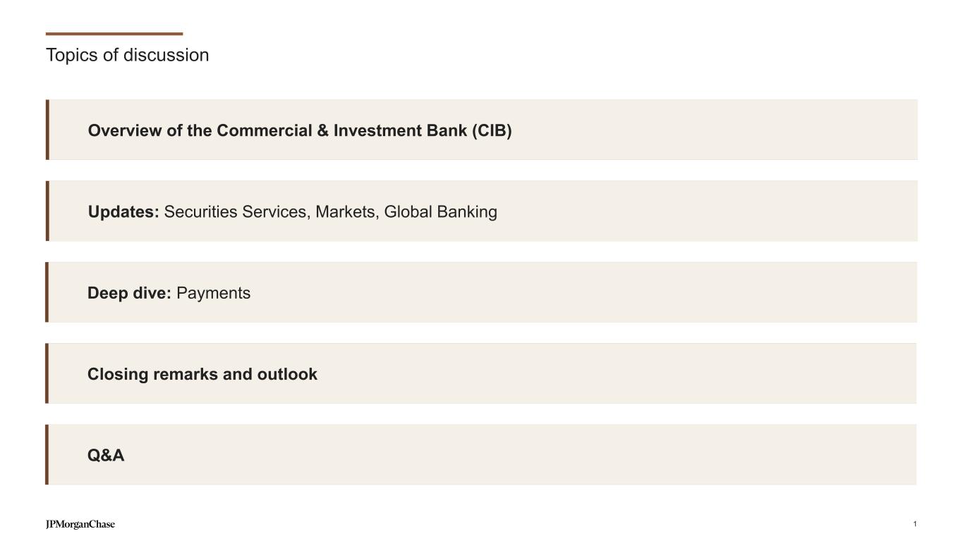 Overview of the Commercial & Investment Bank (CIB) Updates: Securities Services, Markets, Global Banking Deep dive: Payments Closing remarks and outlook Q&A Topics of discussion 1
