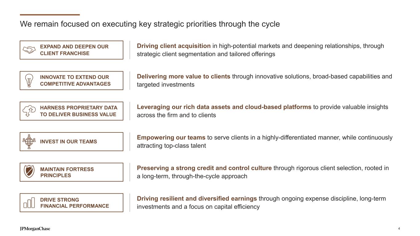 EXCEPTIONAL TALENT & CULTURE Our franchise strength is a key differentiator and provides unmatched value 60+ countries with on-the- ground presence 74 of top 75 MSAs with dedicated team 120+ currencies settled ~70% of revenue in NIR, across different fees ~40% of revenue generated internationally ~100K clients across CIB businesses3 ~$1.3T capital raised for clients in 2024 ~$3.2T trades settled daily on average4 $10T+ payments processed daily on average5 GLOBAL & LOCAL DIVERSIFIED AT SCALECOMPLETE of products where we are a market leader2~95% of the Fortune 500 do business with us90%+ client penetration with U.S. Middle Market121% For footnoted information, refer to slide 37 3