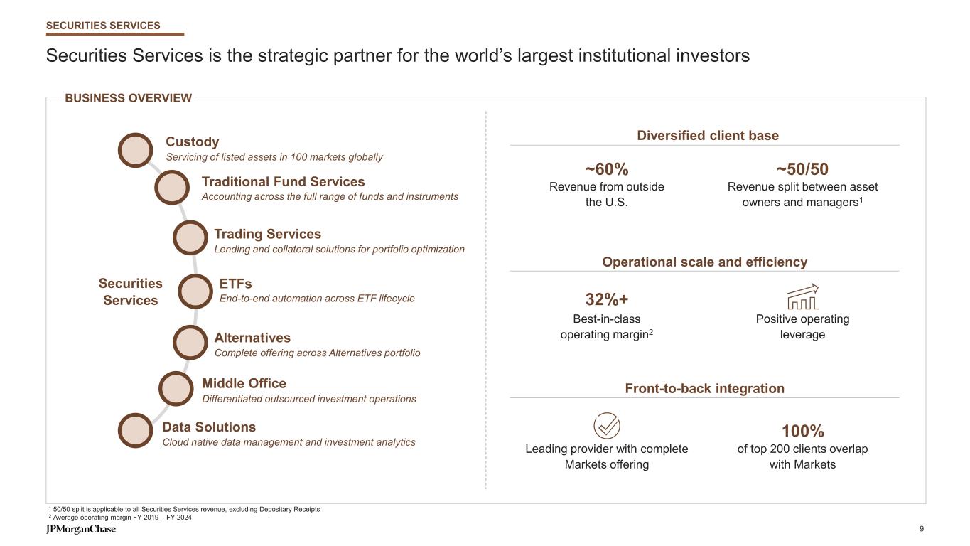 Executing a multi-faceted growth agenda powered by our connected businesses PARTNERSHIP AND ALIGNMENT UNLOCK VALUE… …AND POSITION US TO CAPTURE SIGNIFICANT MARKET OPPORTUNITIES Continuous collaboration with our AWM and CCB partners LARGE AND GROWING ADDRESSABLE MARKETS POWERFUL TAILWINDS ~$1.7T Private Credit global market size2 ~$370B Global VC investment in 20241 ~60K Prospects in North America Middle Market PAYMENTS MARKETS GLOBAL BANKING SECURITIES SERVICES ~$320T Cross border transactions expected by 20324 ~65% Emerging markets’ contribution to global economic growth by 20356 ~$1.6T Financing needed to develop digital infrastructure (2025-2030)5 For footnoted information, refer to slide 38 8 ~$6T 2024 Global PE AUM3