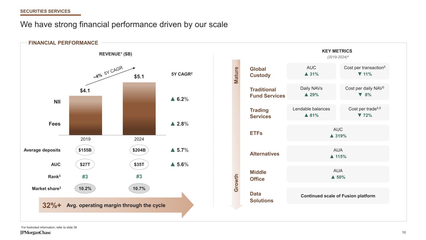 We have strong financial performance driven by our scale FINANCIAL PERFORMANCE 2019 2024 NII Fees ▲ 2.8% ▲ 6.2% $5.1 $4.1 10.2%Market share3 10.7% ▲ 5.7% ▲ 5.6% $155B $204B $27T $35T Average deposits AUC #3 #3Rank3 Avg. operating margin through the cycle M at ur e G ro w th Global Custody Cost per transaction5 ▼ 11% AUC ▲ 31% Traditional Fund Services Cost per daily NAV5 ▼ 8% Daily NAVs ▲ 29% Trading Services Cost per trade5,6 ▼ 72% Lendable balances ▲ 81% ETFs AUC ▲ 319% Alternatives AUA ▲ 115% Middle Office AUA ▲ 50% Data Solutions Continued scale of Fusion platform 5Y CAGR2 KEY METRICS (2019-2024)4 REVENUE1 ($B) 32%+ For footnoted information, refer to slide 39 SECURITIES SERVICES 10