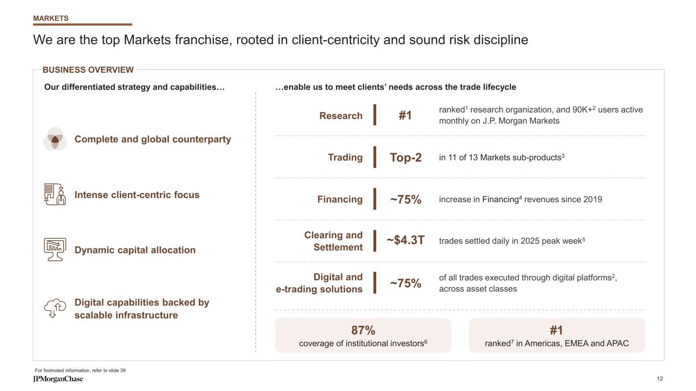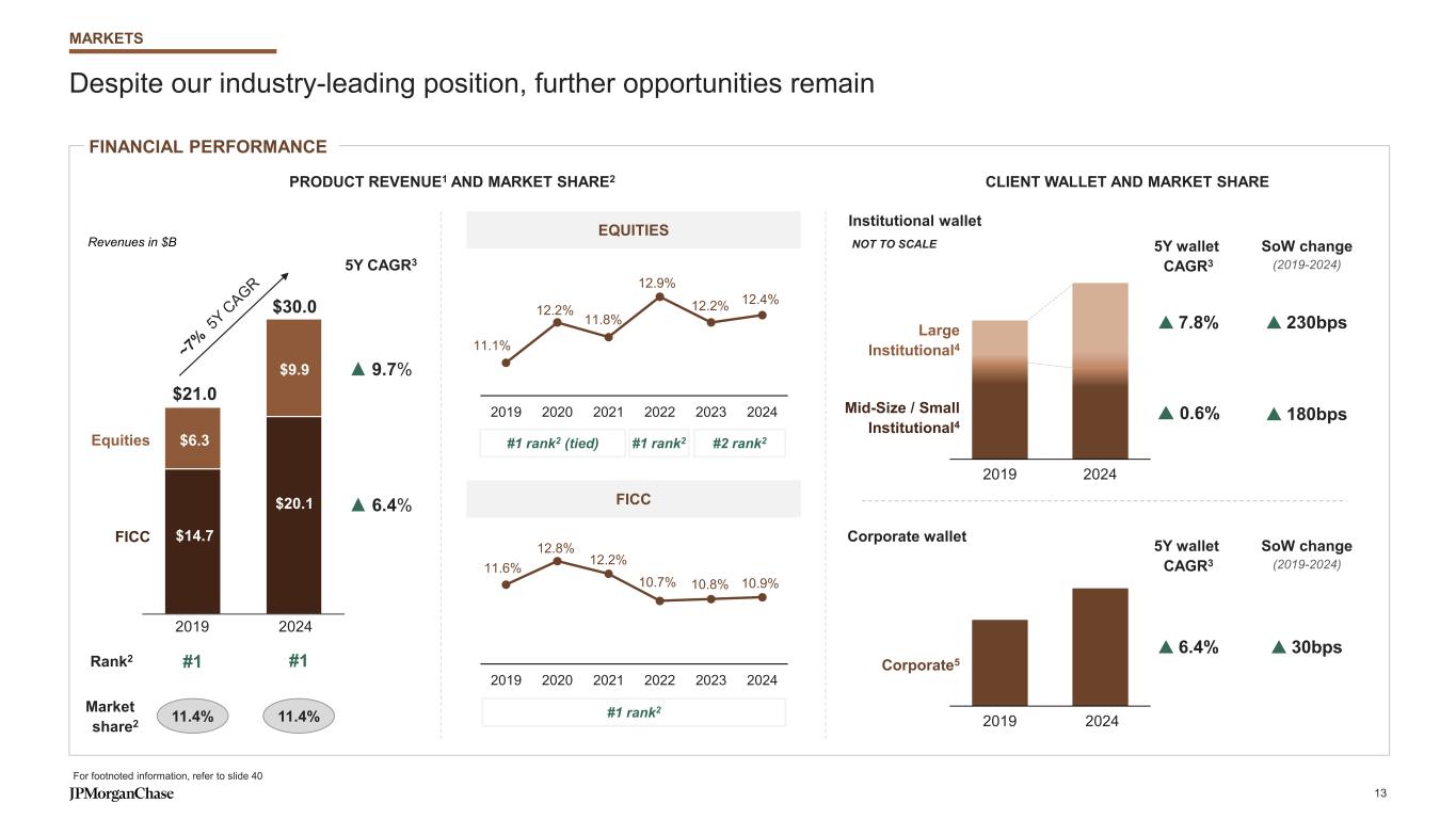 We are the top Markets franchise, rooted in client-centricity and sound risk discipline …enable us to meet clients’ needs across the trade lifecycle ranked1 research organization, and 90K+2 users active monthly on J.P. Morgan Markets #1Research in 11 of 13 Markets sub-products3Top-2Trading increase in Financing4 revenues since 2019 ~75%Financing trades settled daily in 2025 peak week5~$4.3TClearing and Settlement of all trades executed through digital platforms2, across asset classes~75%Digital and e-trading solutions BUSINESS OVERVIEW Our differentiated strategy and capabilities… Dynamic capital allocation Intense client-centric focus 87% coverage of institutional investors6 #1 ranked7 in Americas, EMEA and APAC For footnoted information, refer to slide 39 Digital capabilities backed by scalable infrastructure MARKETS Complete and global counterparty 12