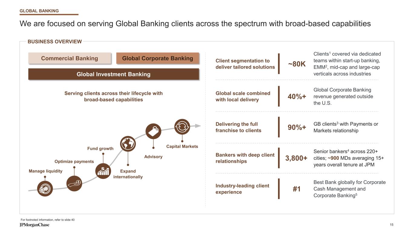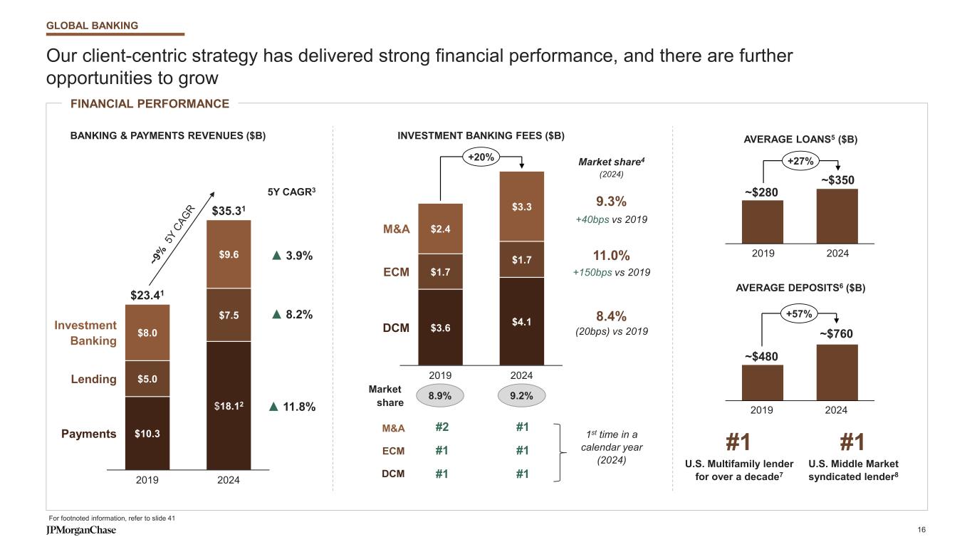 We are focused on serving Global Banking clients across the spectrum with broad-based capabilities BUSINESS OVERVIEW Serving clients across their lifecycle with broad-based capabilities Advisory Expand internationally Manage liquidity Capital MarketsFund growth Optimize payments Commercial Banking Global Corporate Banking Global Investment Banking Global Corporate Banking revenue generated outside the U.S. 40%+Global scale combined with local delivery GB clients3 with Payments or Markets relationship90%+Delivering the full franchise to clients Best Bank globally for Corporate Cash Management and Corporate Banking5 #1Industry-leading client experience Clients1 covered via dedicated teams within start-up banking, EMM2, mid-cap and large-cap verticals across industries ~80KClient segmentation to deliver tailored solutions Senior bankers4 across 220+ cities; ~900 MDs averaging 15+ years overall tenure at JPM 3,800+Bankers with deep client relationships For footnoted information, refer to slide 40 GLOBAL BANKING 15