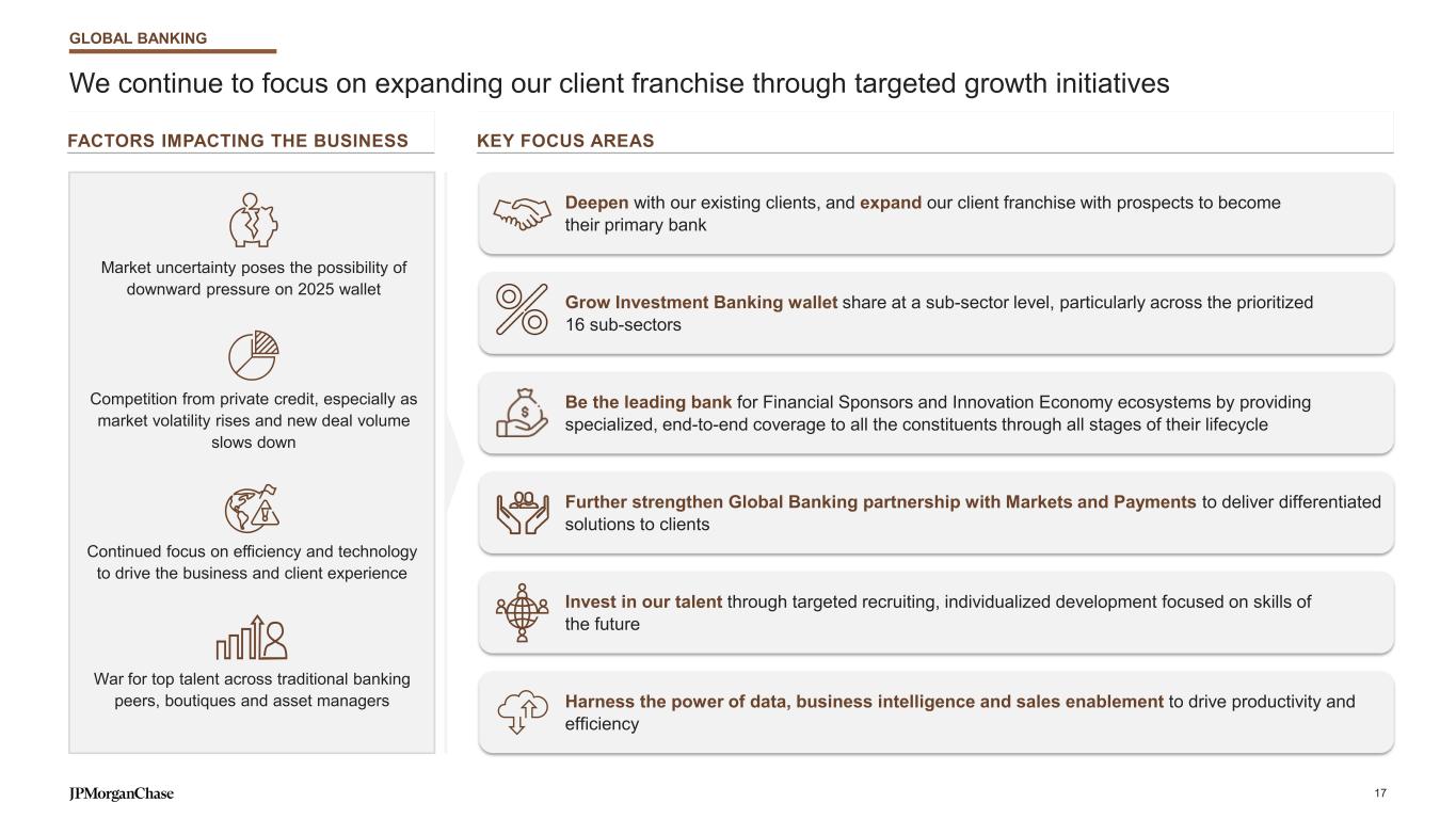 Our client-centric strategy has delivered strong financial performance, and there are further opportunities to grow For footnoted information, refer to slide 41 FINANCIAL PERFORMANCE 1st time in a calendar year (2024) 2019 2024 ~$280 ~$350 +27% AVERAGE LOANS5 ($B) 2019 2024 ~$480 ~$760 +57% AVERAGE DEPOSITS6 ($B) BANKING & PAYMENTS REVENUES ($B) INVESTMENT BANKING FEES ($B) Market share4 (2024) 9.3% 11.0% +40bps vs 2019 +150bps vs 2019 8.4% (20bps) vs 2019$3.6 $4.1 $1.7 $1.7 $2.4 $3.3 2019 2024 M&A ECM DCM +20% $8.0 $5.0 $10.3 2019 $9.6 $7.5 $18.12 2024 Investment Banking Lending Payments $23.41 $35.31 5Y CAGR3 ▲ 3.9% ▲ 8.2% ▲ 11.8% 8.9%Market share 9.2% #2 #1 #1 #1 #1 #1 M&A ECM DCM #1 U.S. Multifamily lender for over a decade7 #1 U.S. Middle Market syndicated lender8 GLOBAL BANKING 16