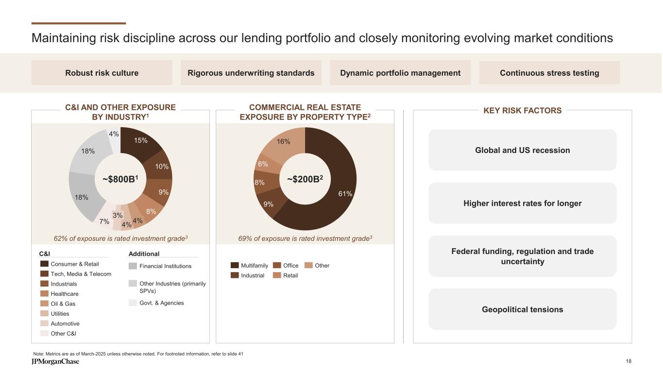 62% of exposure is rated investment grade3 Maintaining risk discipline across our lending portfolio and closely monitoring evolving market conditions Note: Metrics are as of March-2025 unless otherwise noted. For footnoted information, refer to slide 41 Continuous stress testingDynamic portfolio managementRobust risk culture Rigorous underwriting standards Global and US recession Higher interest rates for longer Federal funding, regulation and trade uncertainty Geopolitical tensions KEY RISK FACTORS 15% 10% 9% 8% 4%7% 18% 18% 4% 4% 3% Consumer & Retail Tech, Media & Telecom Industrials Healthcare Oil & Gas Utilities Automotive Other C&I ~$800B1 Financial Institutions Other Industries (primarily SPVs) Govt. & Agencies C&I Additional COMMERCIAL REAL ESTATE EXPOSURE BY PROPERTY TYPE2 69% of exposure is rated investment grade3 61% 9% 8% 6% 16% Multifamily Industrial Office Retail Other ~$200B2 C&I AND OTHER EXPOSURE BY INDUSTRY1 18