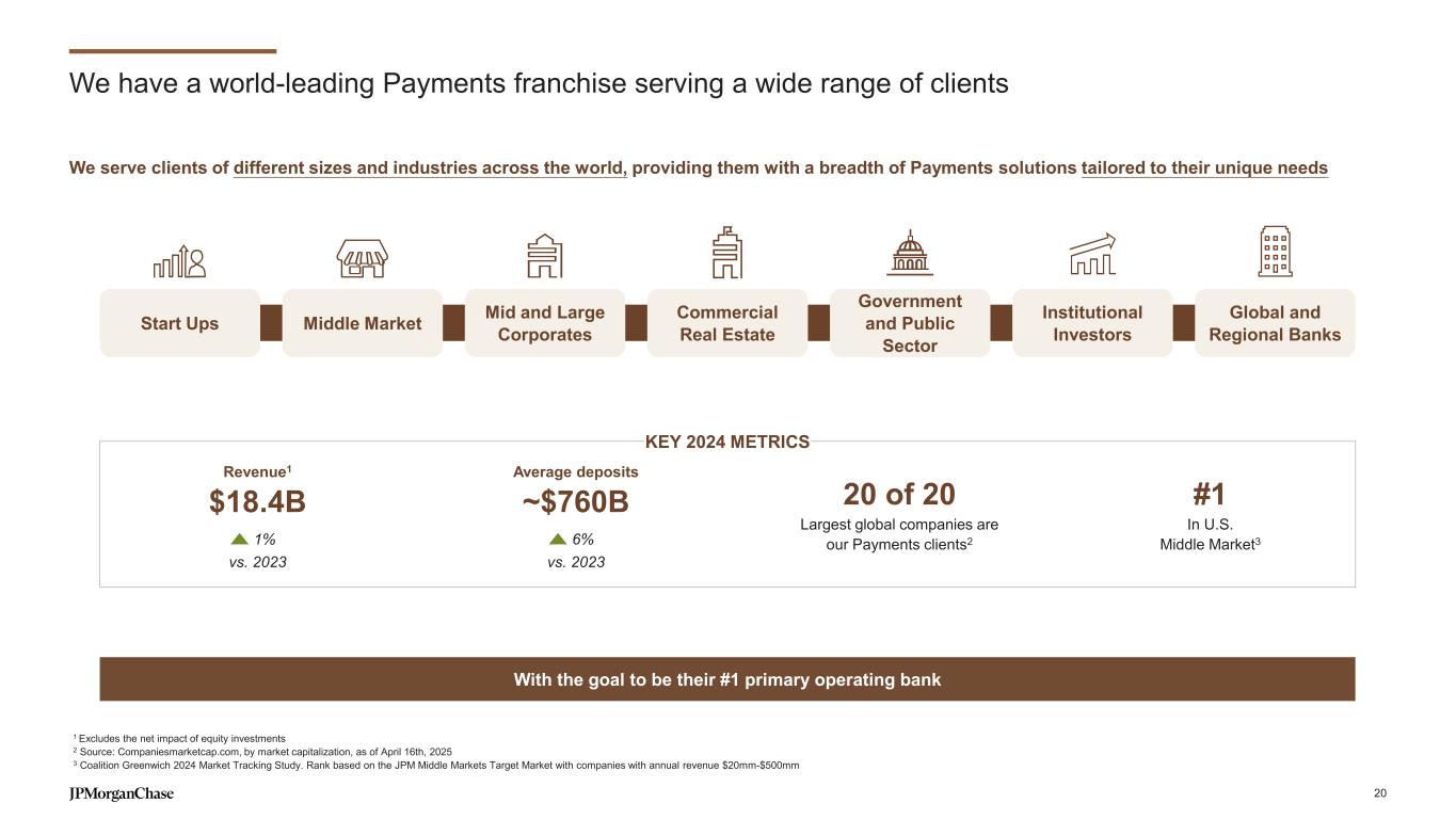 We have a world-leading Payments franchise serving a wide range of clients We serve clients of different sizes and industries across the world, providing them with a breadth of Payments solutions tailored to their unique needs With the goal to be their #1 primary operating bank Middle MarketStart Ups Mid and Large Corporates Government and Public Sector Institutional Investors Global and Regional Banks Commercial Real Estate vs. 2023 Revenue1 $18.4B 1% Average deposits ~$760B 6% vs. 2023 #1 In U.S. Middle Market3 20 of 20 Largest global companies are our Payments clients2 KEY 2024 METRICS 1 Excludes the net impact of equity investments 2 Source: Companiesmarketcap.com, by market capitalization, as of April 16th, 2025 3 Coalition Greenwich 2024 Market Tracking Study. Rank based on the JPM Middle Markets Target Market with companies with annual revenue $20mm-$500mm 20