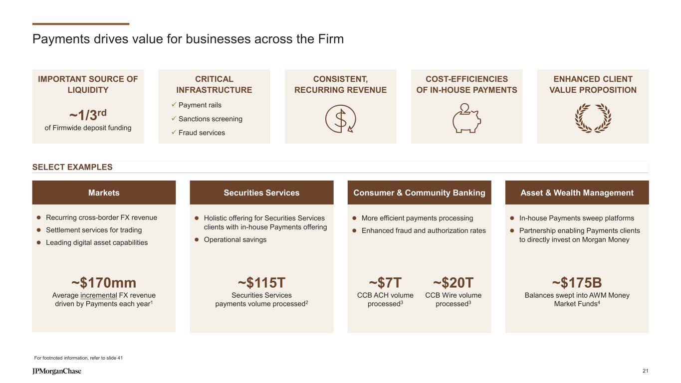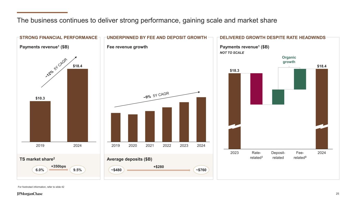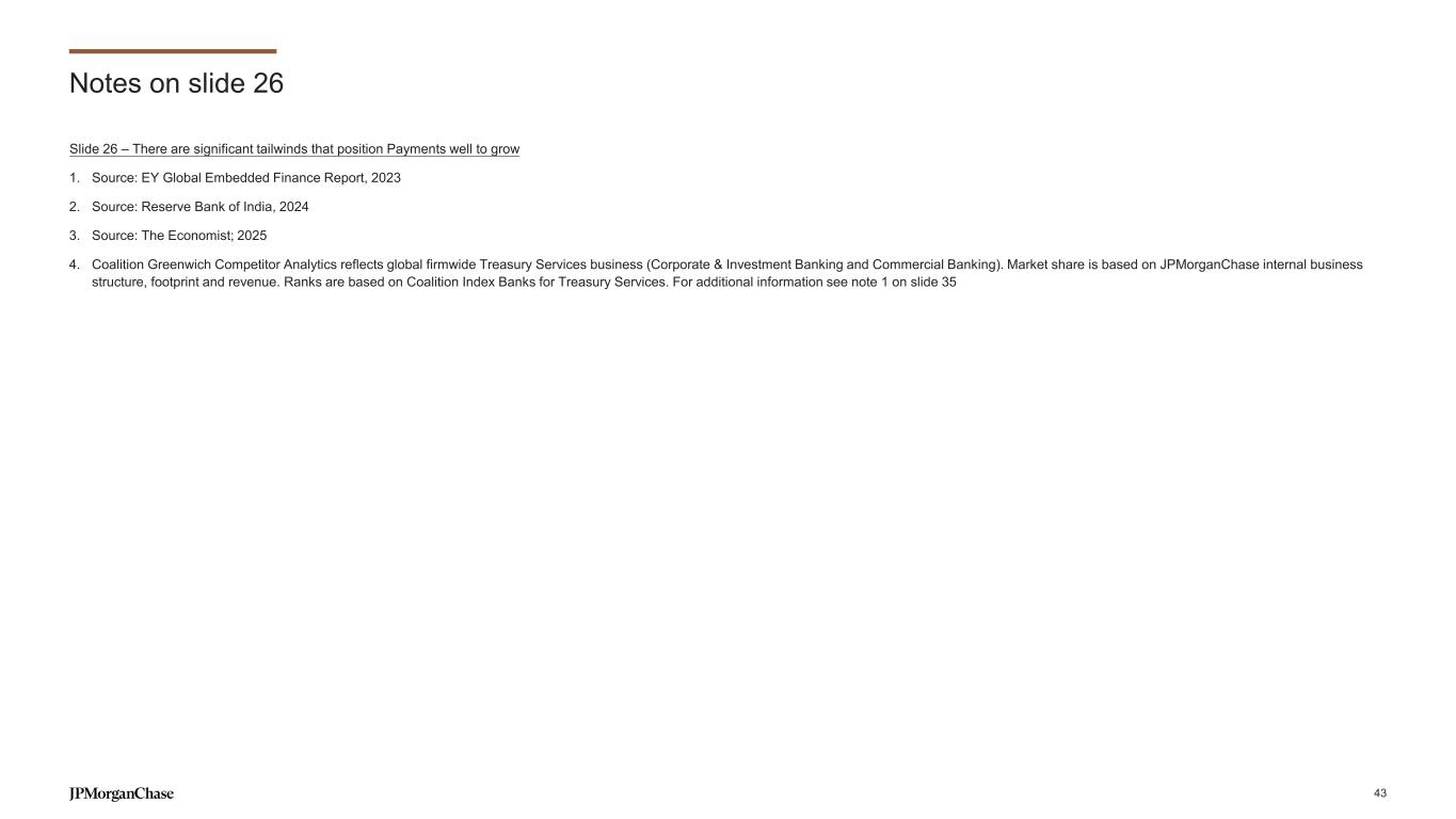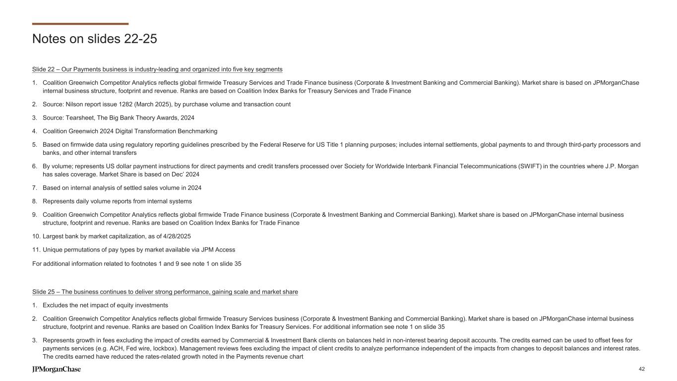Notes on slides 22-25 Slide 22 – Our Payments business is industry-leading and organized into five key segments 1. Coalition Greenwich Competitor Analytics reflects global firmwide Treasury Services and Trade Finance business (Corporate & Investment Banking and Commercial Banking). Market share is based on JPMorganChase internal business structure, footprint and revenue. Ranks are based on Coalition Index Banks for Treasury Services and Trade Finance 2. Source: Nilson report issue 1282 (March 2025), by purchase volume and transaction count 3. Source: Tearsheet, The Big Bank Theory Awards, 2024 4. Coalition Greenwich 2024 Digital Transformation Benchmarking 5. Based on firmwide data using regulatory reporting guidelines prescribed by the Federal Reserve for US Title 1 planning purposes; includes internal settlements, global payments to and through third-party processors and banks, and other internal transfers 6. By volume; represents US dollar payment instructions for direct payments and credit transfers processed over Society for Worldwide Interbank Financial Telecommunications (SWIFT) in the countries where J.P. Morgan has sales coverage. Market Share is based on Dec’ 2024 7. Based on internal analysis of settled sales volume in 2024 8. Represents daily volume reports from internal systems 9. Coalition Greenwich Competitor Analytics reflects global firmwide Trade Finance business (Corporate & Investment Banking and Commercial Banking). Market share is based on JPMorganChase internal business structure, footprint and revenue. Ranks are based on Coalition Index Banks for Trade Finance 10. Largest bank by market capitalization, as of 4/28/2025 11. Unique permutations of pay types by market available via JPM Access For additional information related to footnotes 1 and 9 see note 1 on slide 35 Slide 25 – The business continues to deliver strong performance, gaining scale and market share 1. Excludes the net impact of equity investments 2. Coalition Greenwich Competitor Analytics reflects global firmwide Treasury Services business (Corporate & Investment Banking and Commercial Banking). Market share is based on JPMorganChase internal business structure, footprint and revenue. Ranks are based on Coalition Index Banks for Treasury Services. For additional information see note 1 on slide 35 3. Represents growth in fees excluding the impact of credits earned by Commercial & Investment Bank clients on balances held in non-interest bearing deposit accounts. The credits earned can be used to offset fees for payments services (e.g. ACH, Fed wire, lockbox). Management reviews fees excluding the impact of client credits to analyze performance independent of the impacts from changes to deposit balances and interest rates. The credits earned have reduced the rates-related growth noted in the Payments revenue chart 42